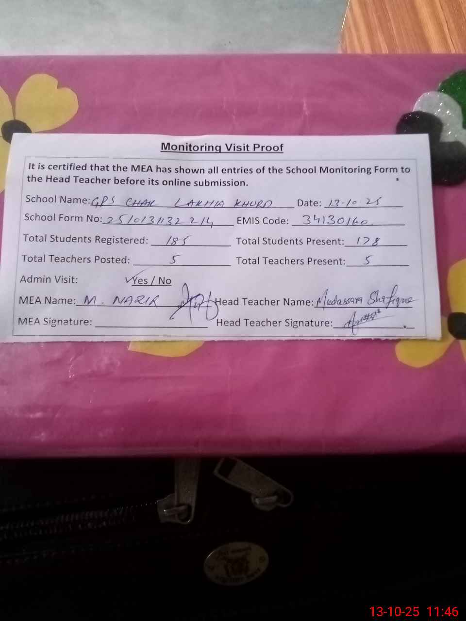 | Attendance Register | Head Teacher | MEA with School | Visit Proof |