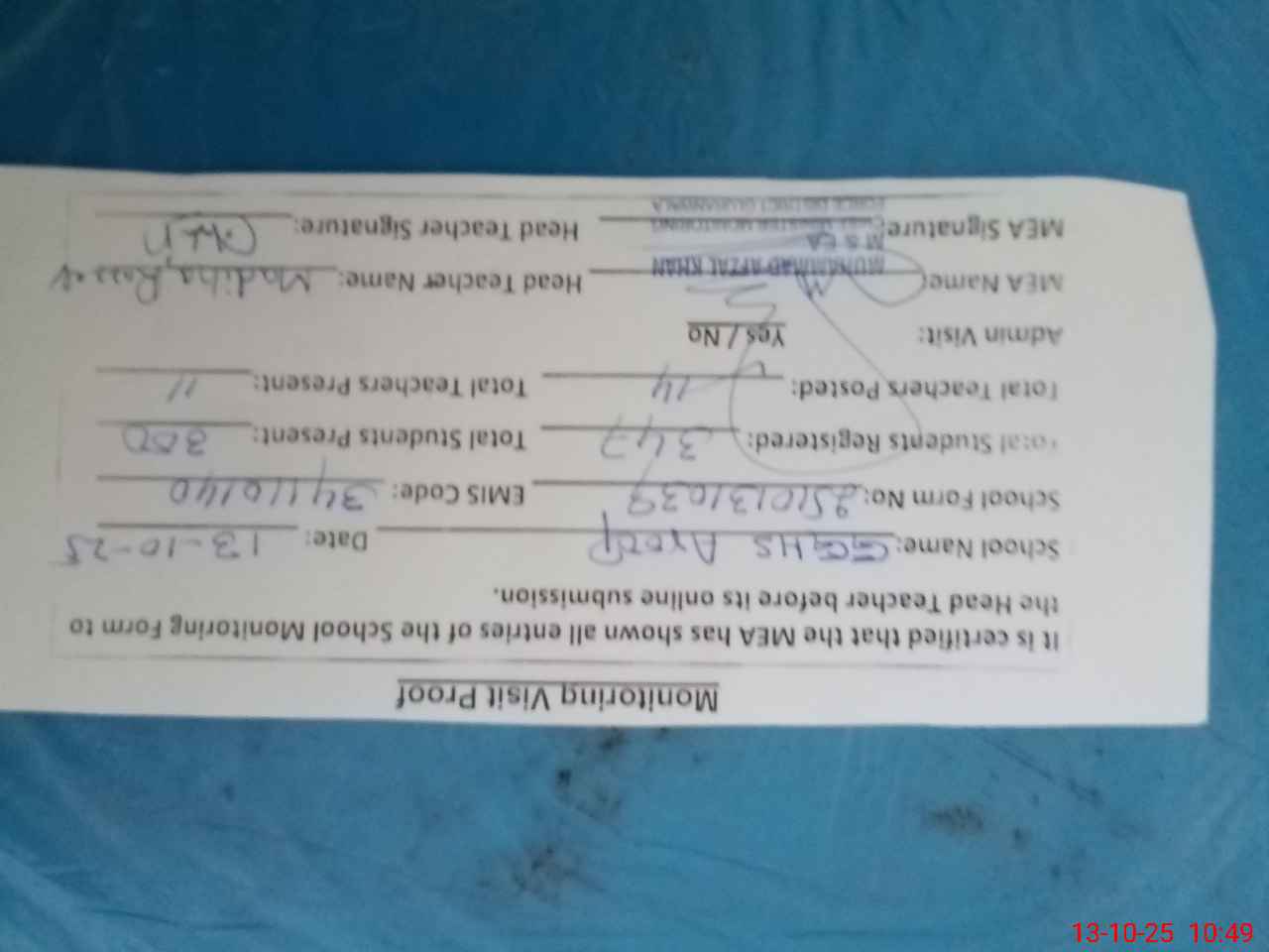 | Certified that this School was Inspected by the Undersigned MEA/DMO Today and the Information Stated Above is as Per Record. | |||||