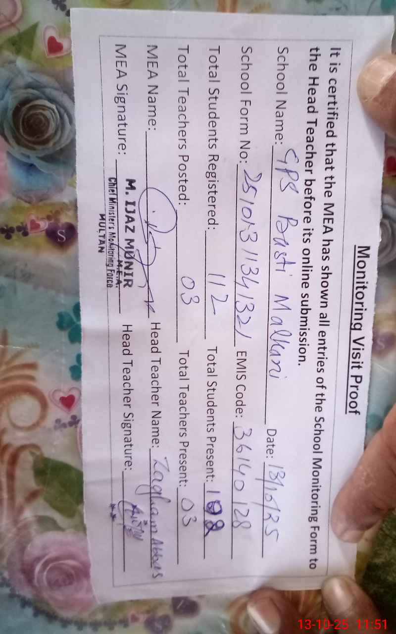 | Certified that this School was Inspected by the Undersigned MEA/DMO Today and the Information Stated Above is as Per Record. | |||||