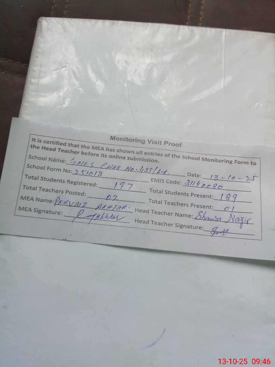 | Attendance Register | Head Teacher | MEA with School | Visit Proof |