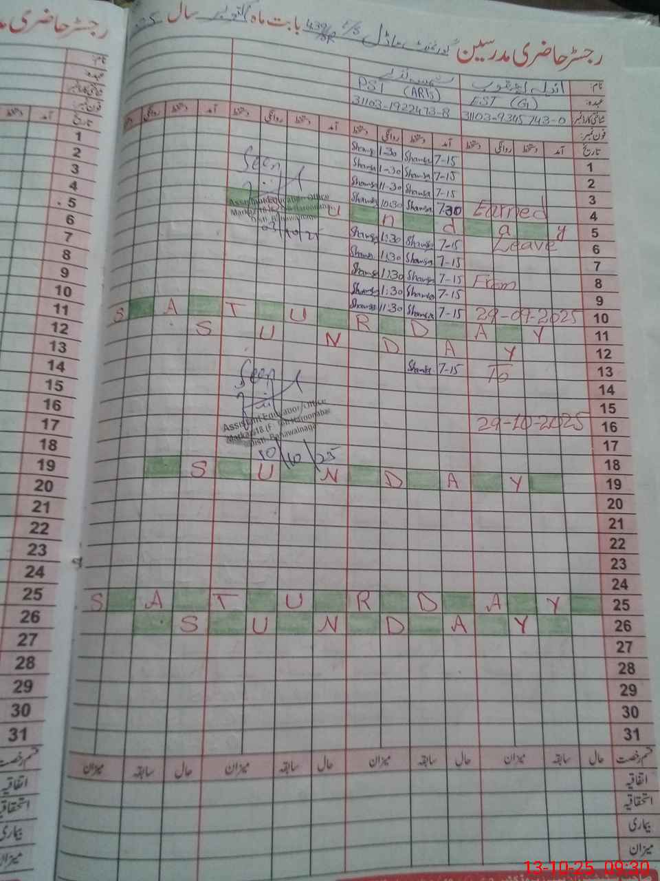 | CNIC | Full Name | Designation | R/C | Absence During Last Calender Month |