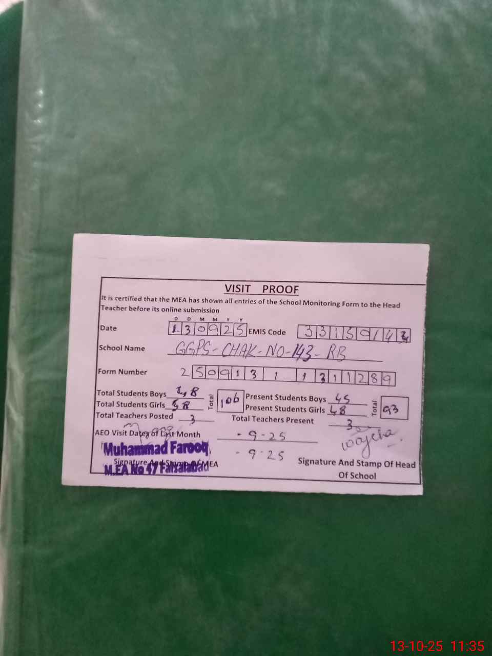 | Attendance Register | Head Teacher | MEA with School | Visit Proof |
