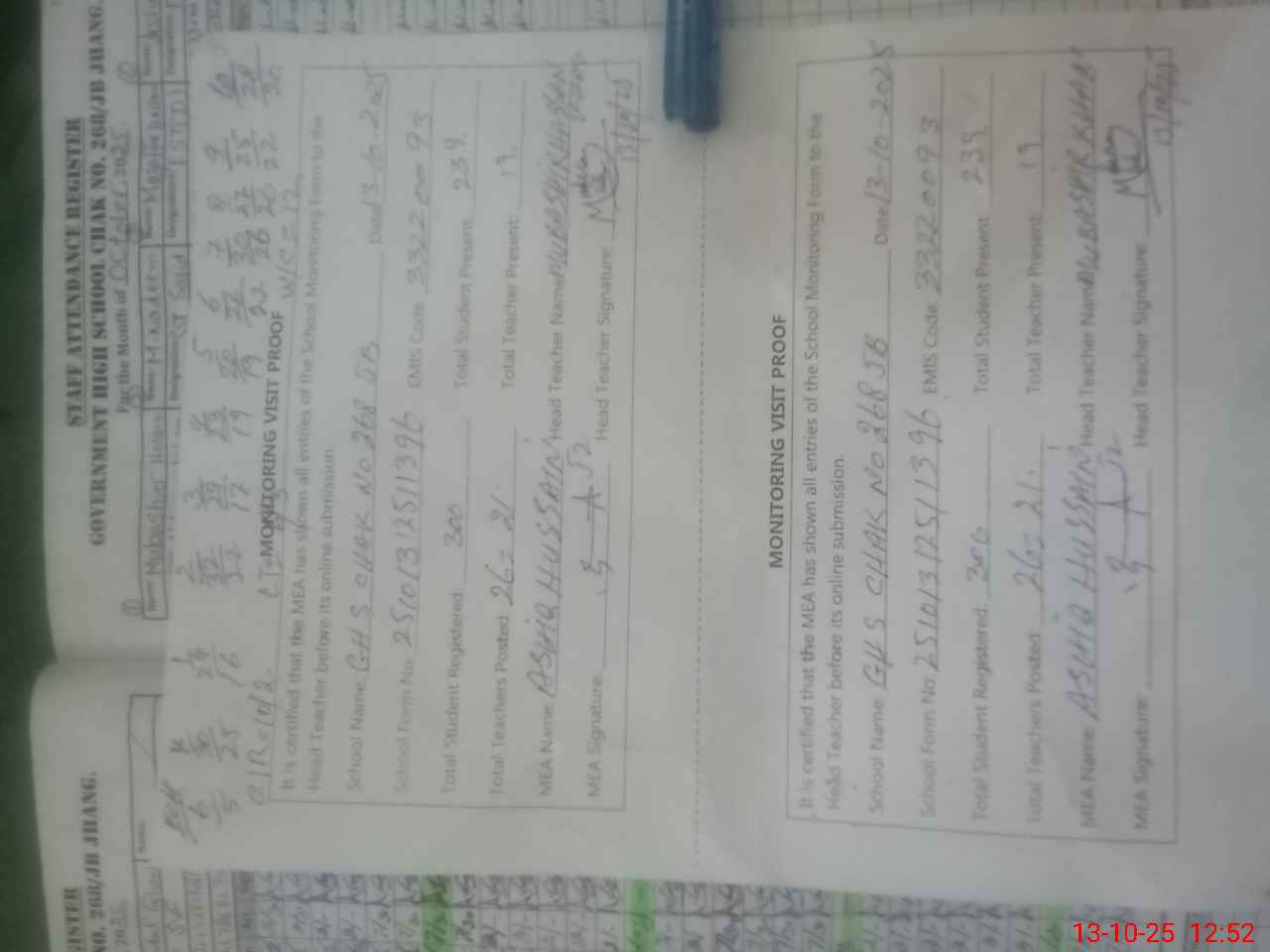 | Attendance Register | Head Teacher | MEA with School | Visit Proof |