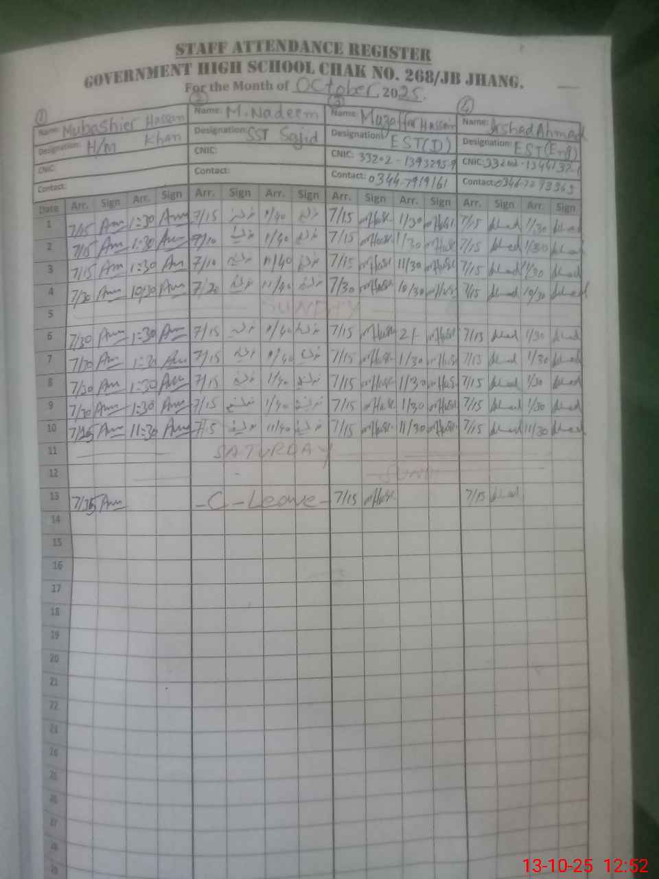 | CNIC | Full Name | Designation | R/C | Absence during last cal. month |