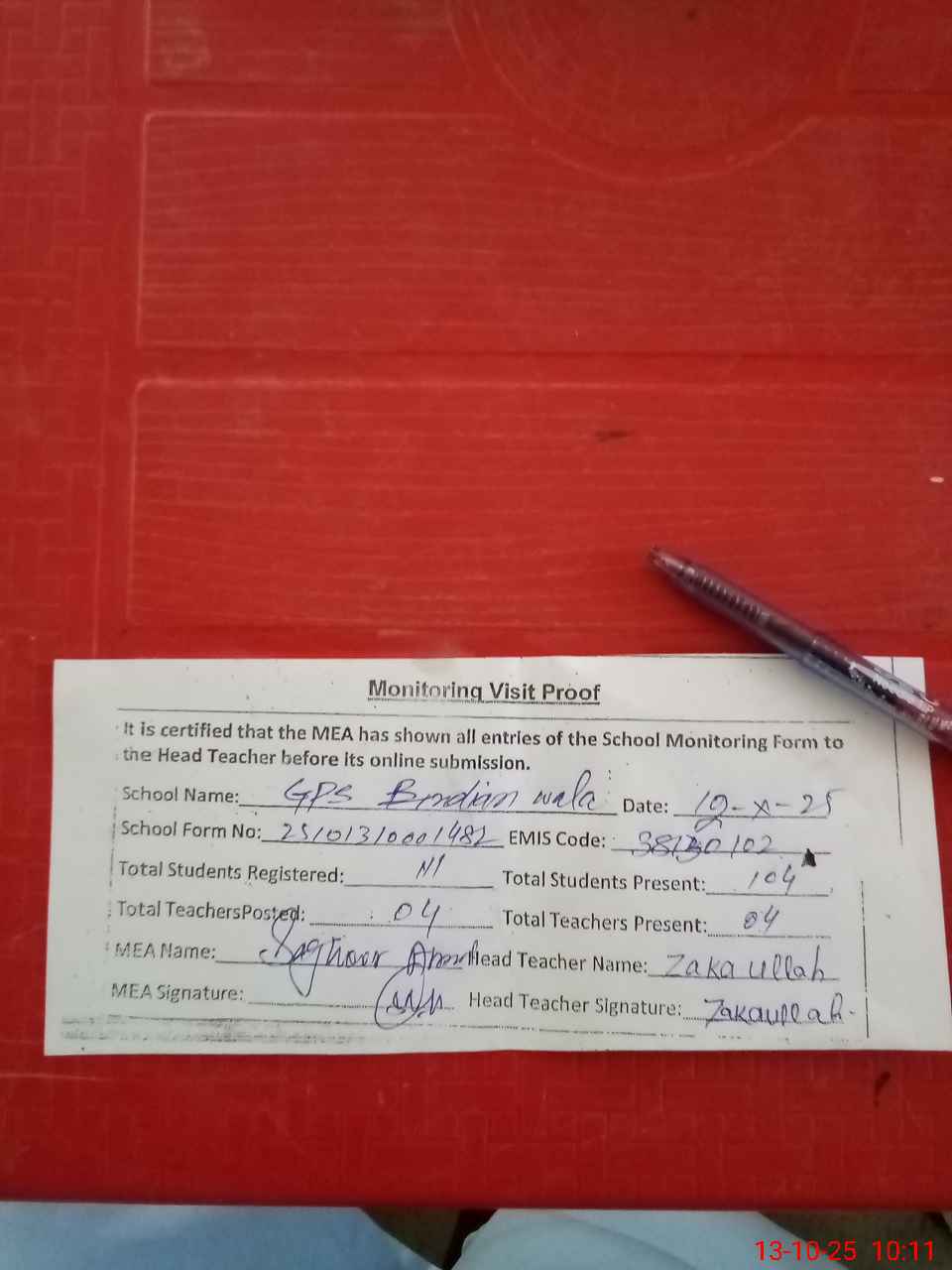 | Attendance Register | Head Teacher | MEA with School | Visit Proof |
