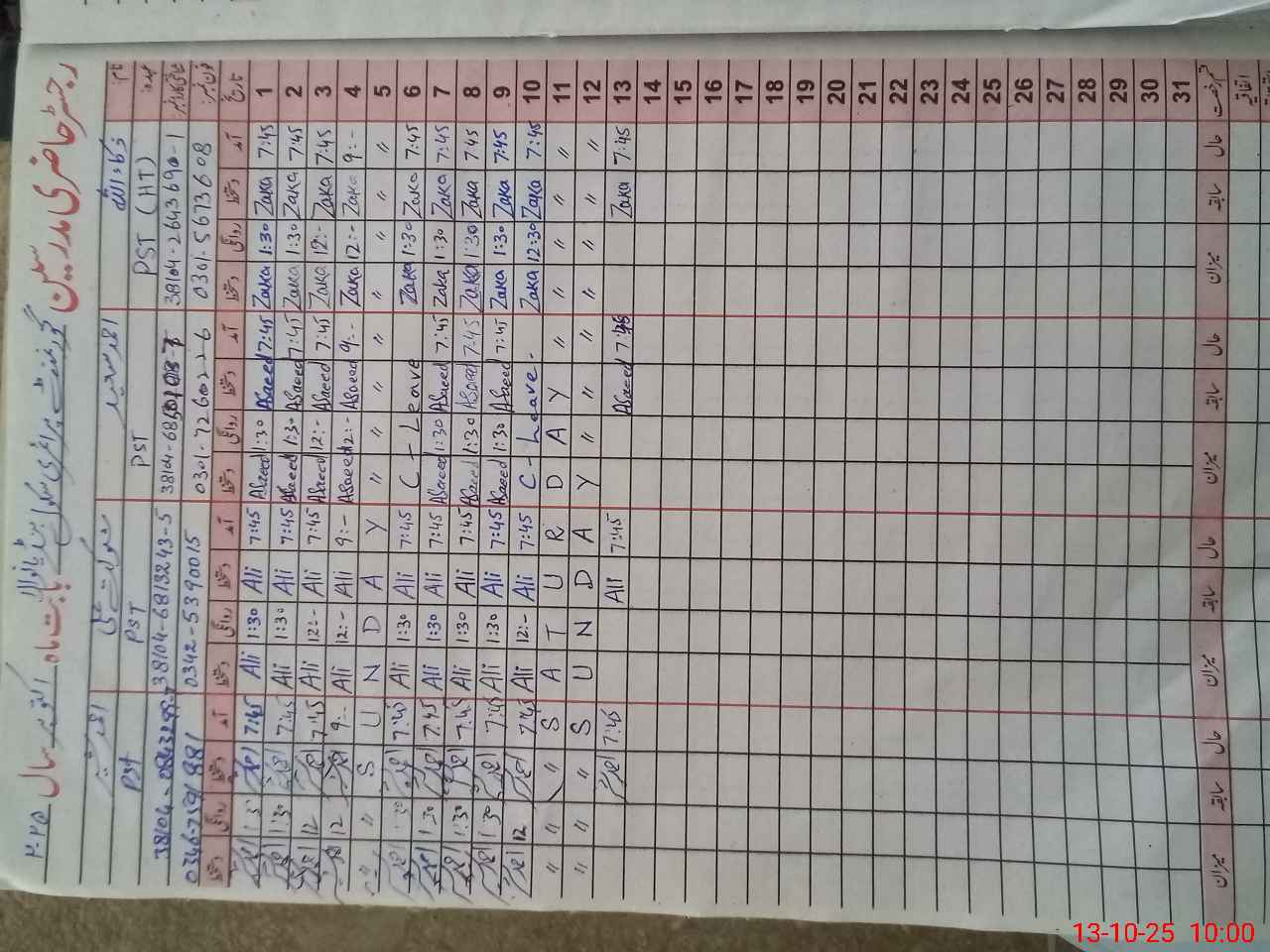 | CNIC | Full Name | Designation | R/C | Absence During Last Calender Month |