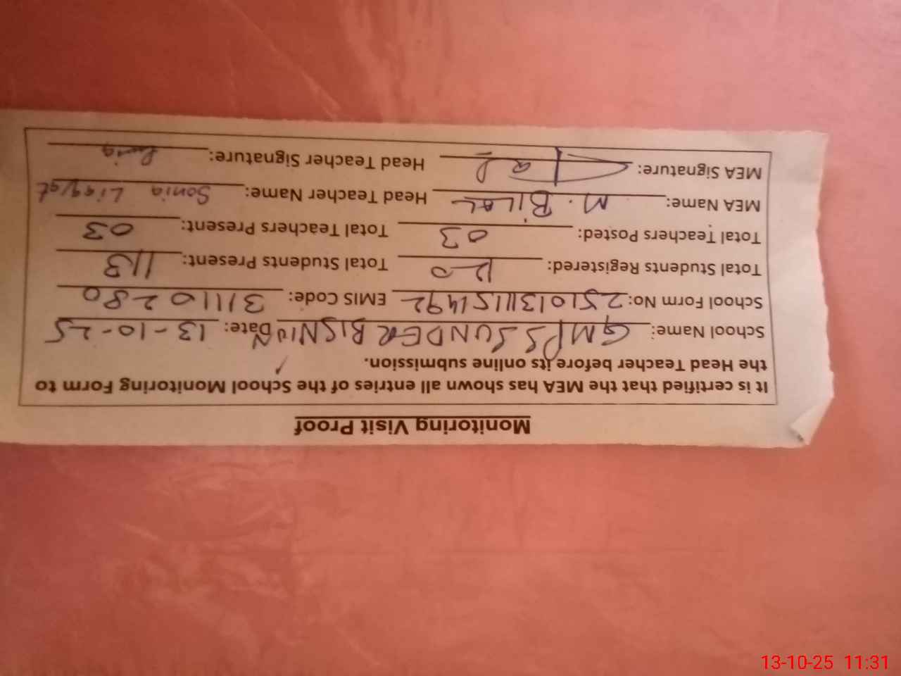 | Attendance Register | Head Teacher | MEA with School | Visit Proof |
