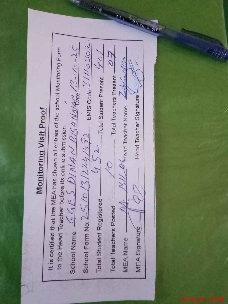 | Certified that this School was Inspected by the Undersigned MEA/DMO Today and the Information Stated Above is as Per Record. | |||||