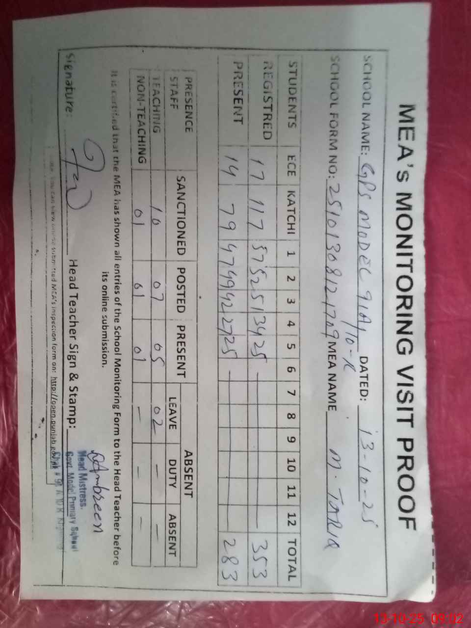 | Attendance Register | Head Teacher | MEA with School | Visit Proof |