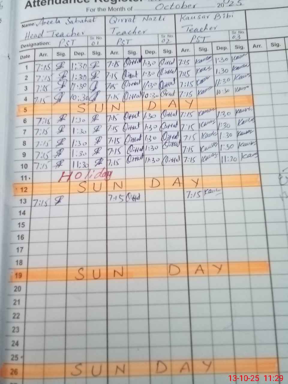 | CNIC | Full Name | Designation | R/C | Absence During Last Calender Month |