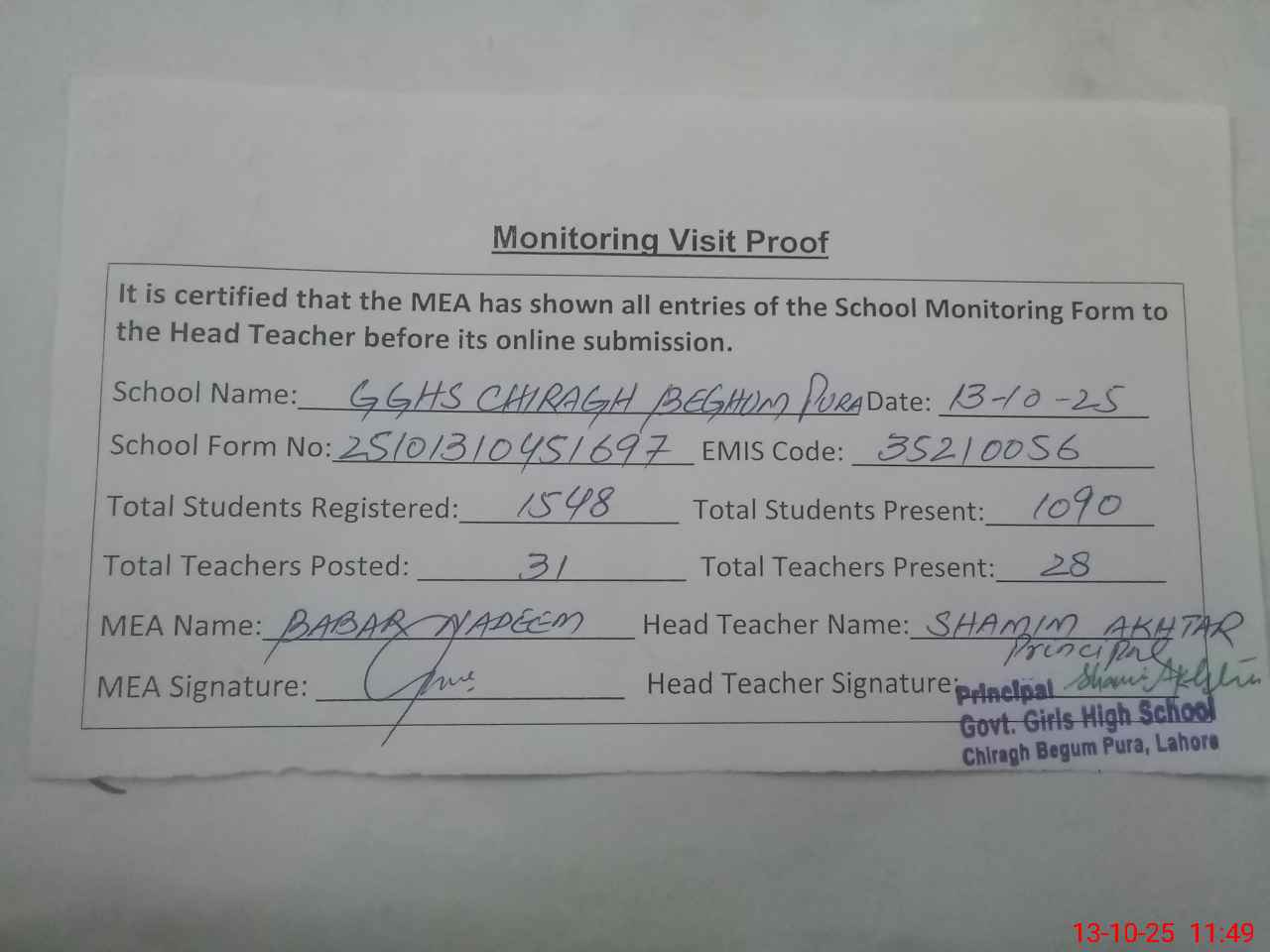 | EMIS Code: 35210056 | Name of School: GGHS CHIRAGH BEGUM PURA | |||