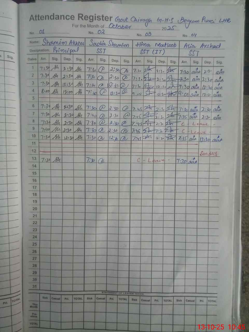 | Remarks (Use Separate Page if Required): 1 The name of Teacher Nusrat Jabeen EST mistakenly enetered twice 2 Teacher Shadab Izhar PST absent from duty since 19 September 2025 to till date | |||||