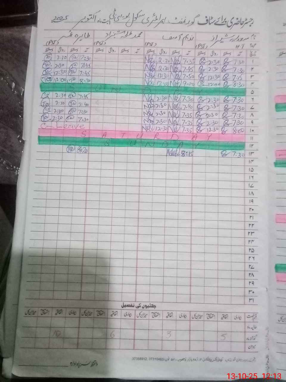 | Remarks (Use Separate Page if Required): Teacher Muhammad Talha Sheraz PST in Medical Leave since 02 September 2025 to till date but his approved leave not available so according to SOPs marked him absent | |||||
