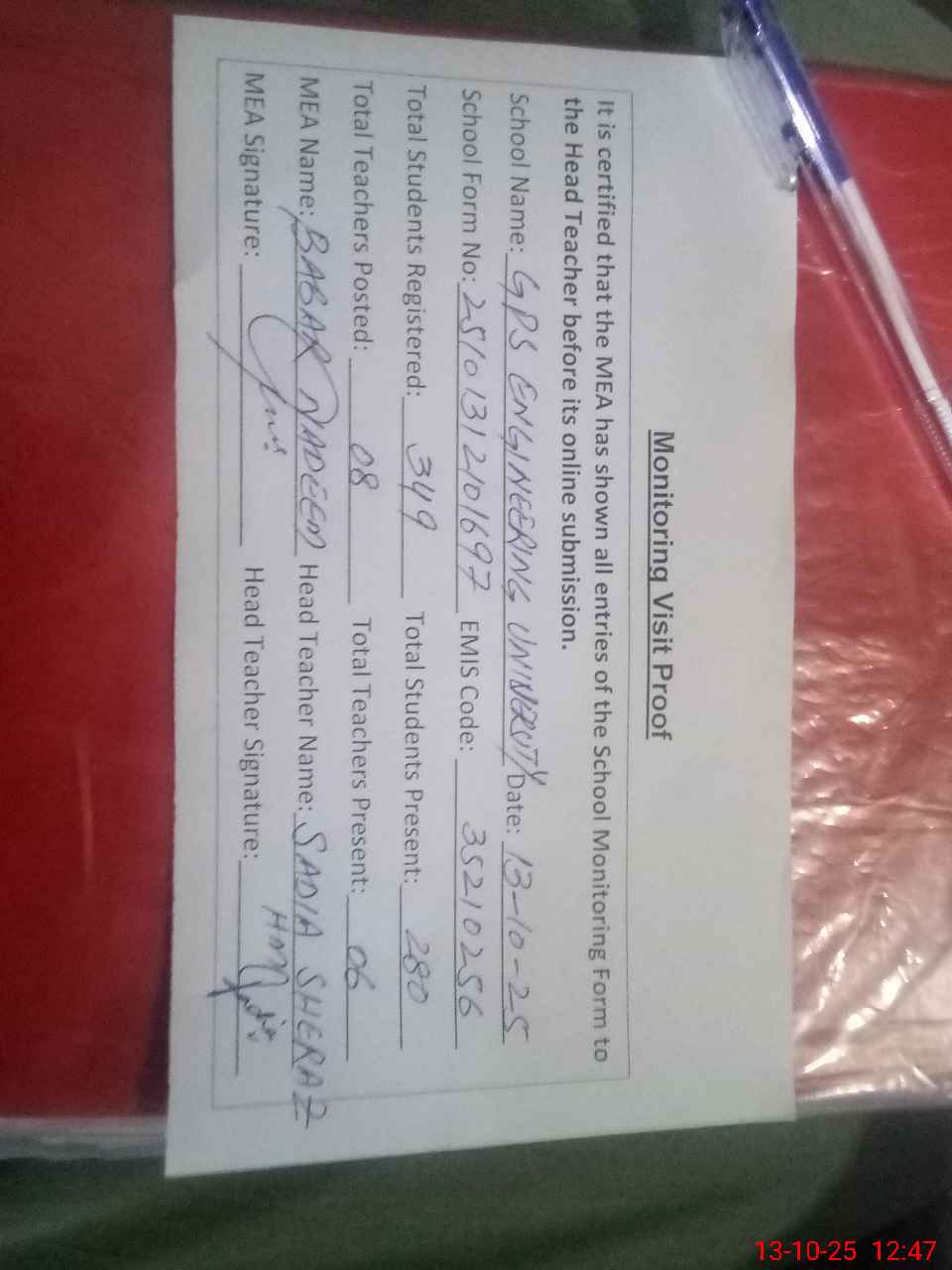 | EMIS Code: 35210256 | Name of School: GPS ENGINEERING UNIVERSITY LHR | |||