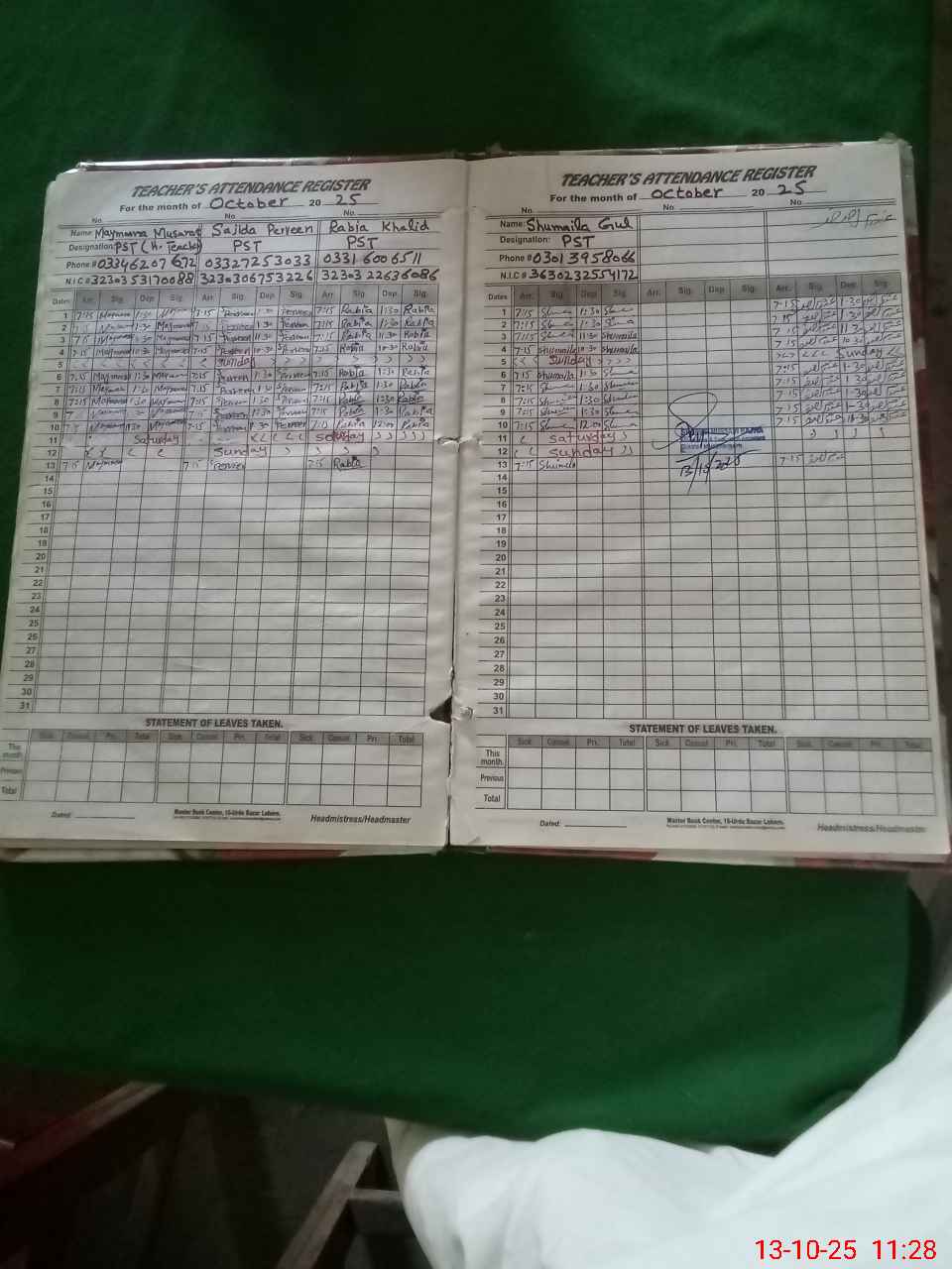 | CNIC | Full Name | Designation | R/C | Absence During Last Calender Month |