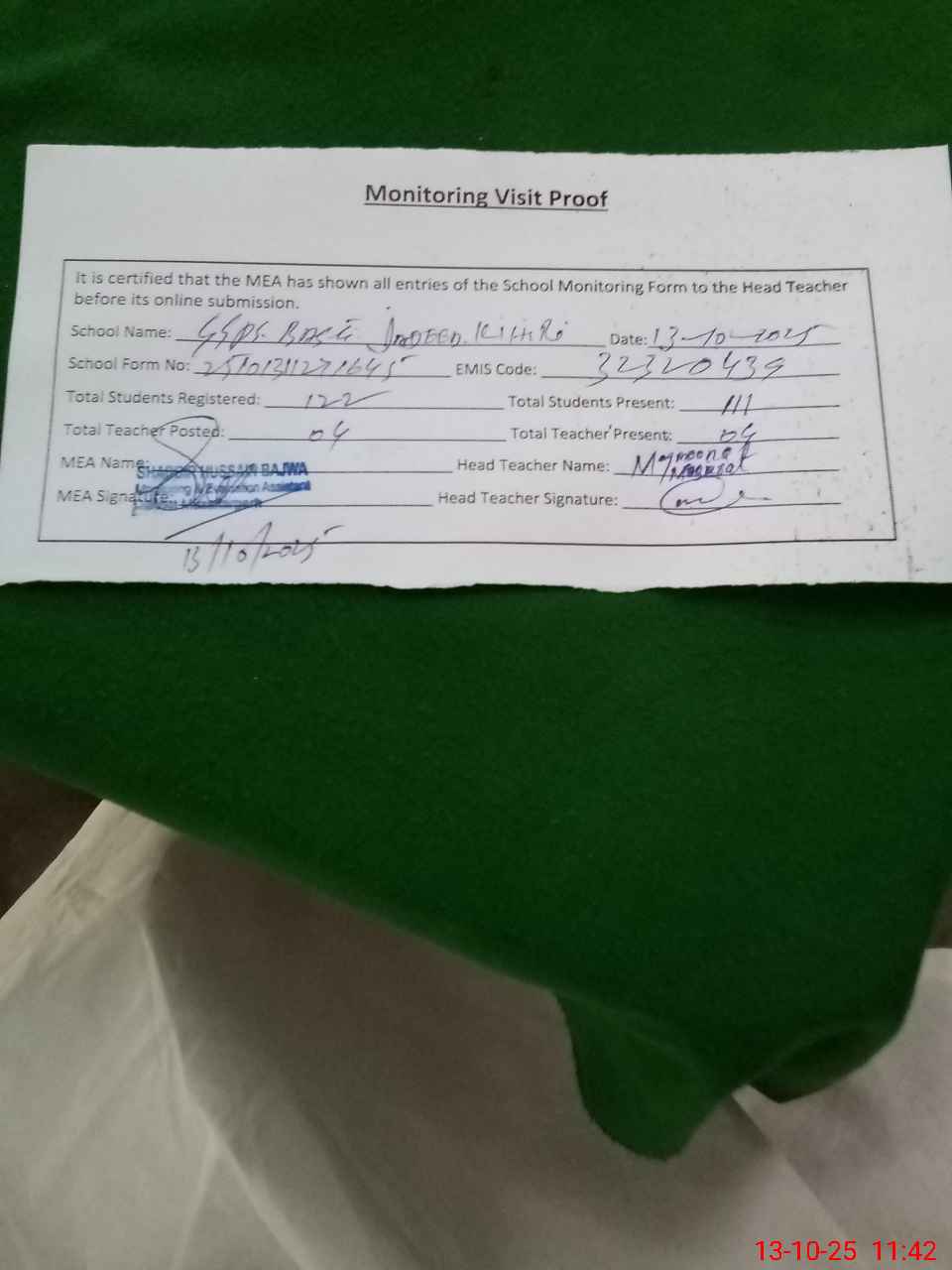 | Attendance Register | Head Teacher | MEA with School | Visit Proof |