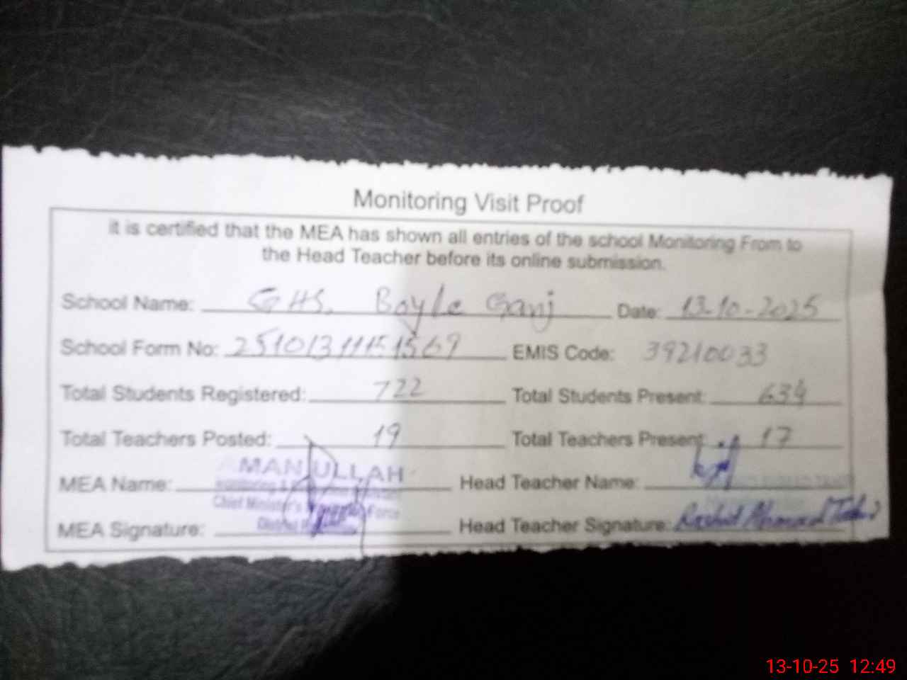 | Certified that this School was Inspected by the Undersigned MEA/DMO Today and the Information Stated Above is as Per Record. | |||||