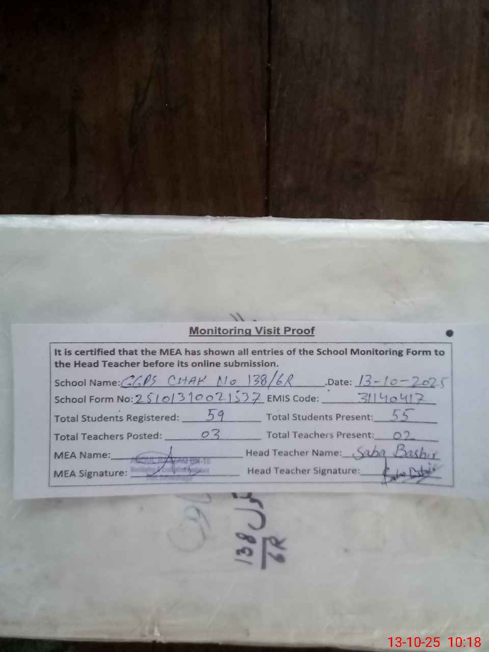 | EMIS Code: 31140417 | Name of School: GGPS CHAK NO 138/6-R | |||