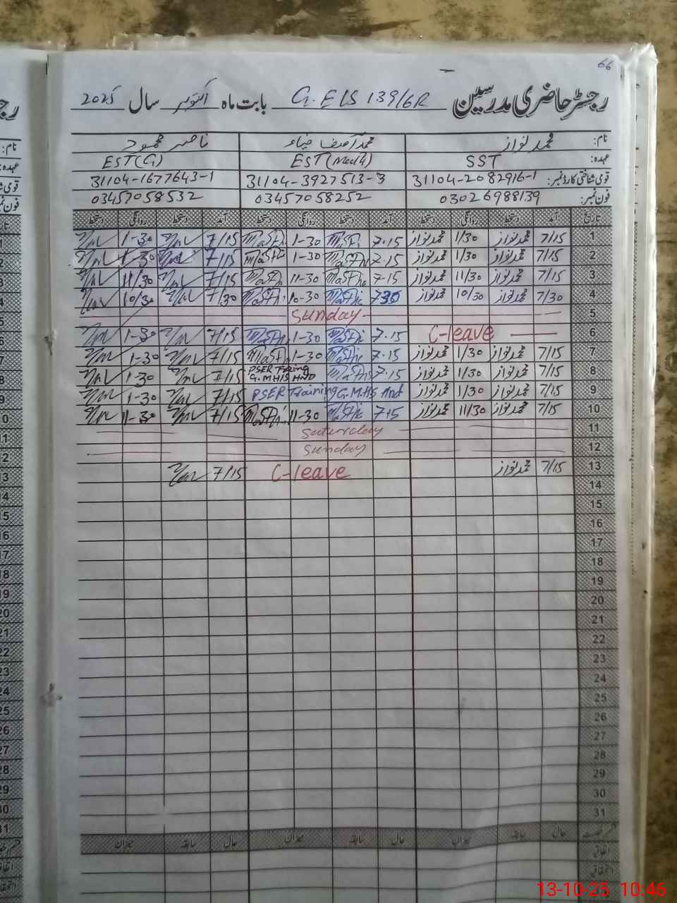| CNIC | Full Name | Designation | R/C | Absence During Last Calender Month |