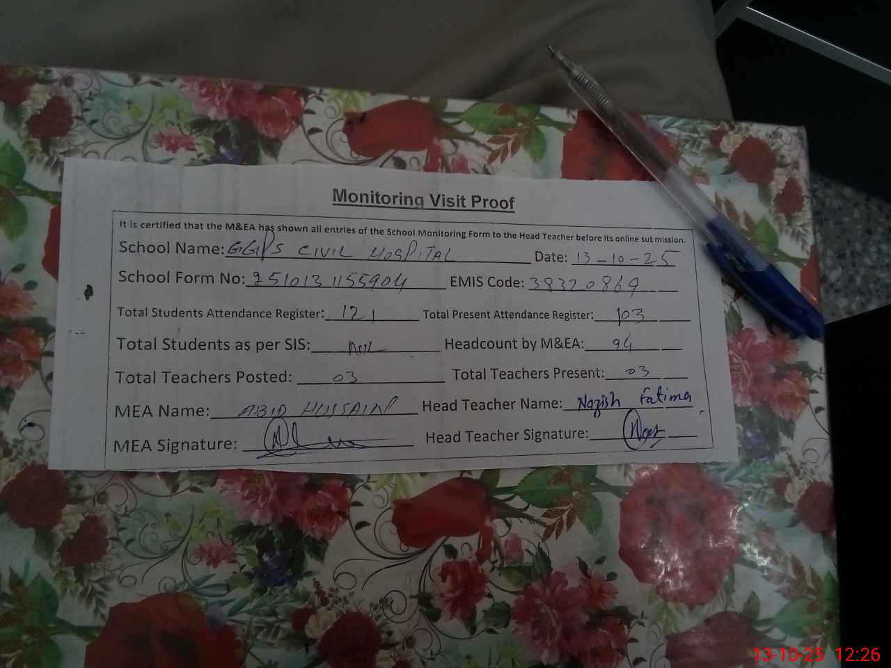 | Attendance Register | Head Teacher | MEA with School | Visit Proof |