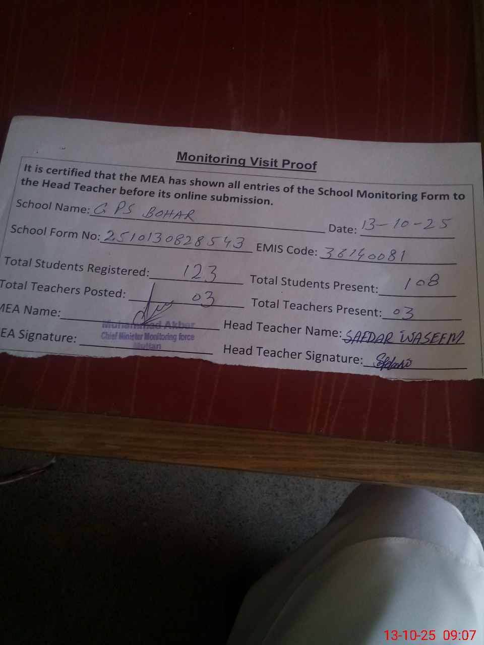 | EMIS Code: 36140081 | Name of School: GPS BOHAR P/O JUGGO WALA | |||