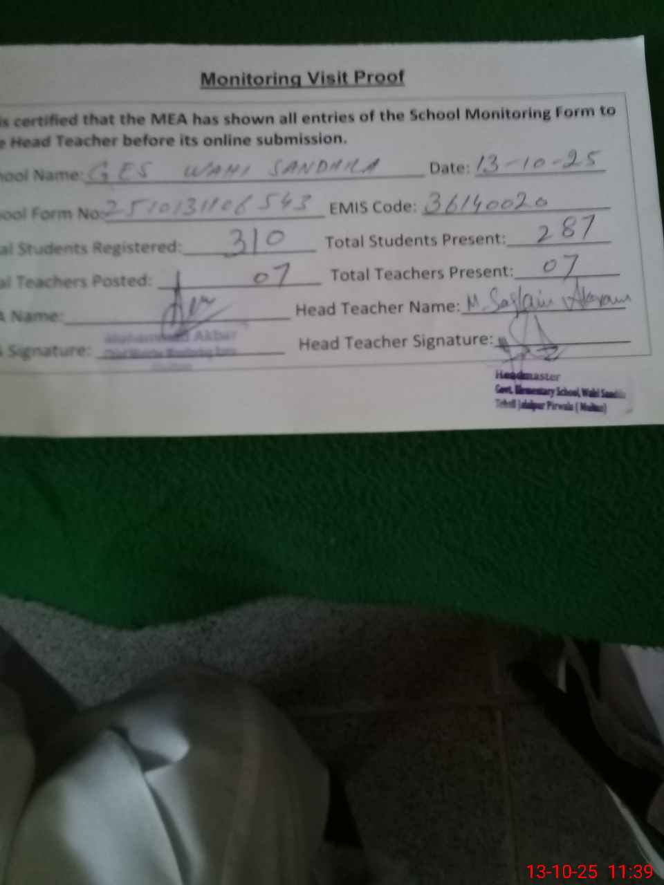 | Attendance Register | Head Teacher | MEA with School | Visit Proof |