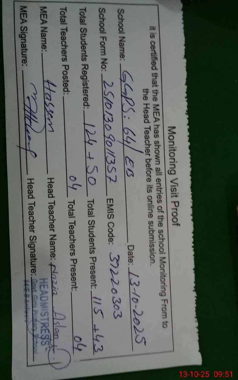 | Attendance Register | Head Teacher | MEA with School | Visit Proof |
