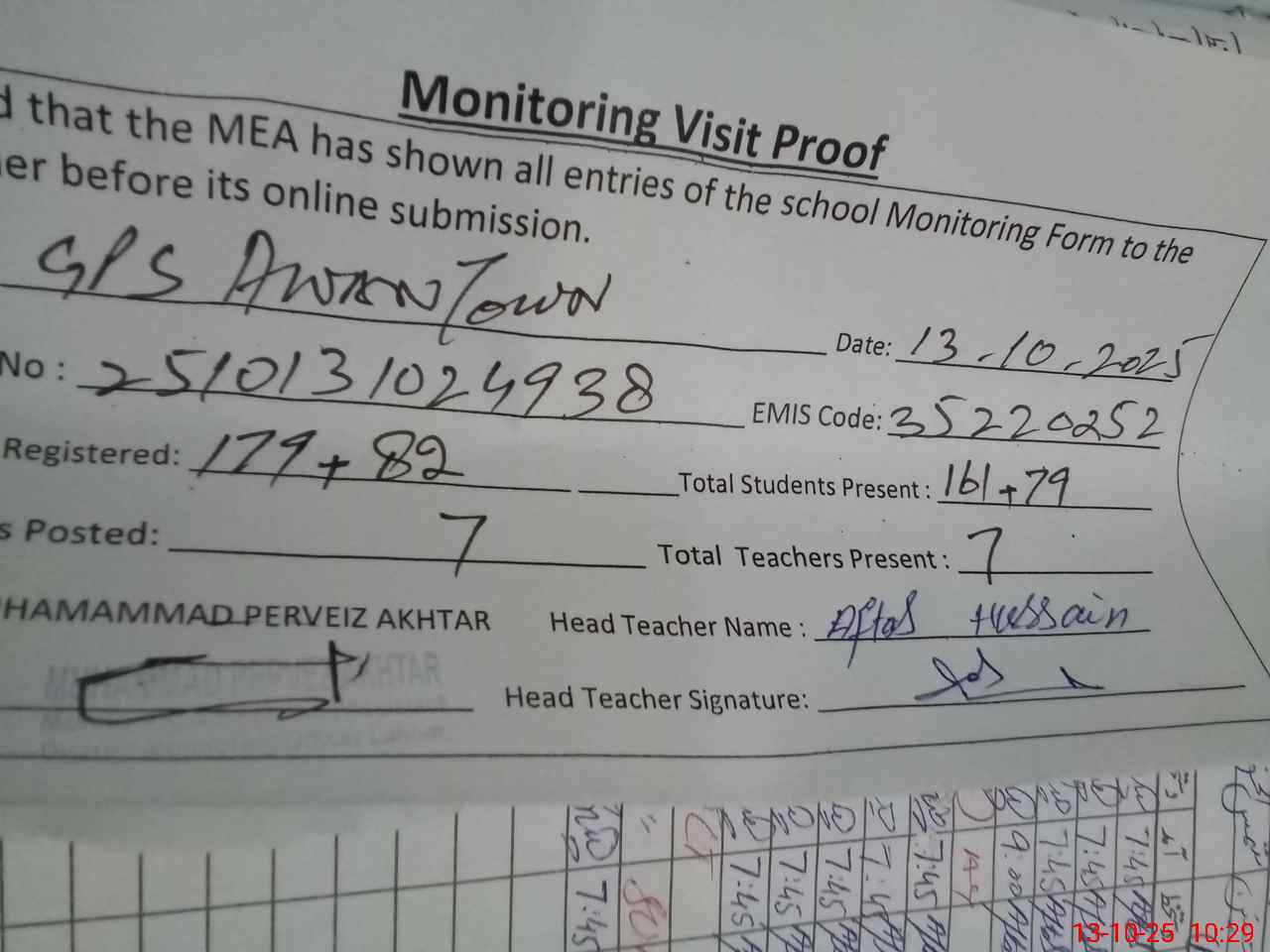 | Attendance Register | Head Teacher | MEA with School | Visit Proof |