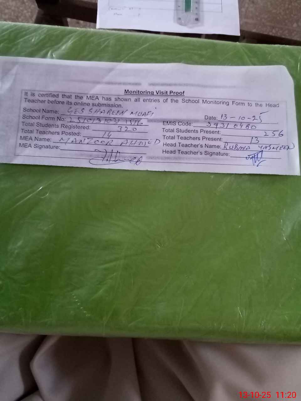 | Attendance Register | Head Teacher | MEA with School | Visit Proof |
