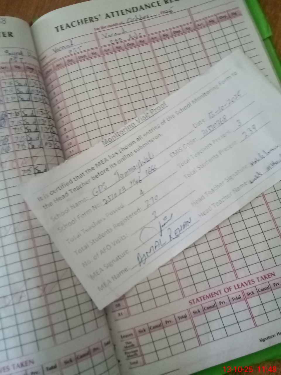| Attendance Register | Head Teacher | MEA with School | Visit Proof |