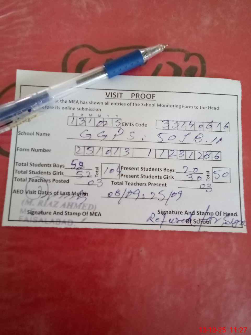 | Attendance Register | Head Teacher | MEA with School | Visit Proof |