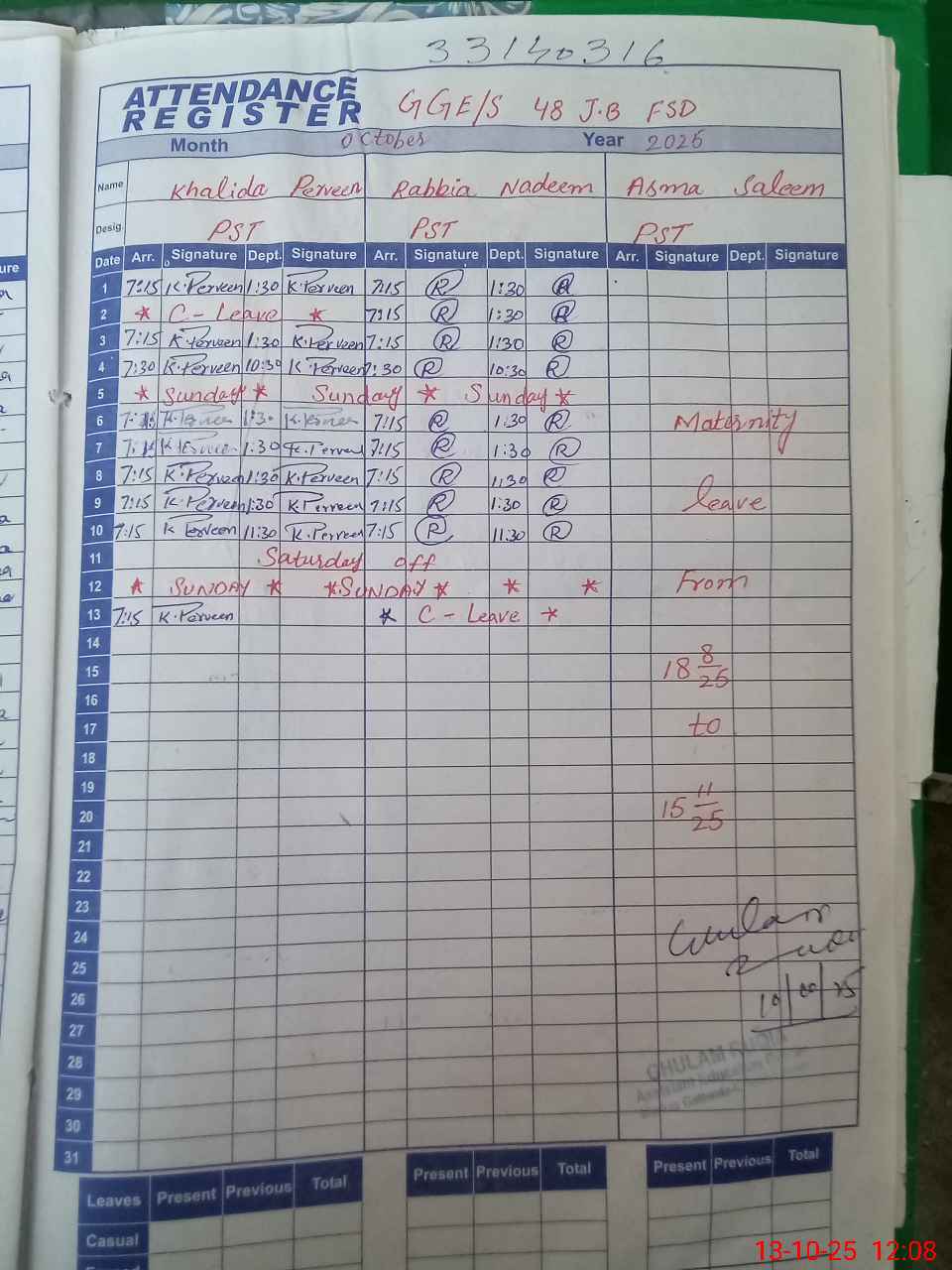 | 33**** | Aa**** Sa**** | PST | Regular | 30 | 0 | 0 | 30 | 0 | 0 | 0 | 0 | 0 | Maternity |