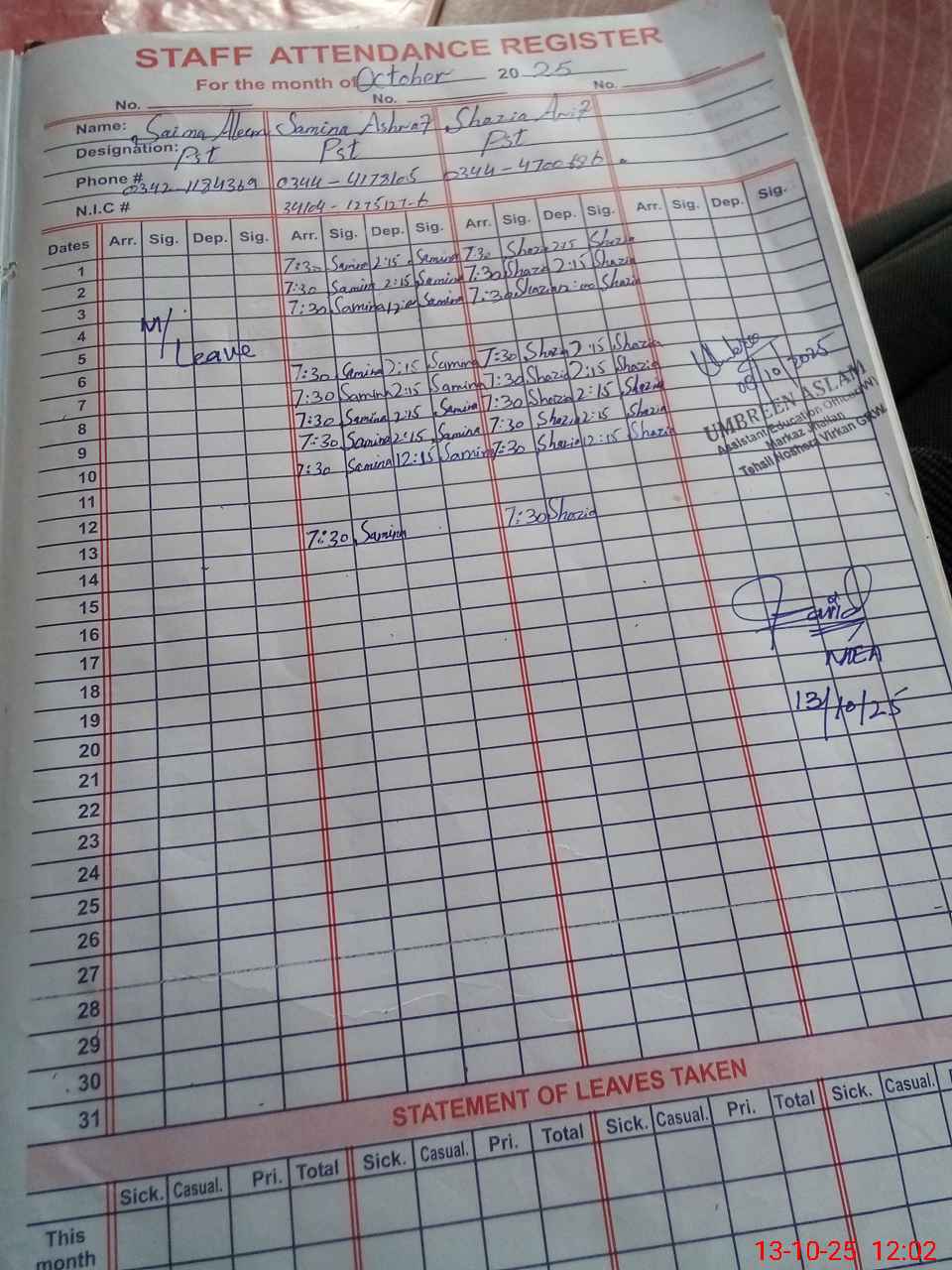 | Name: Sa**** Al**** Designation: (School Headmaster's/Headmistress's) PST Phone/Cell Number: 03**** |
