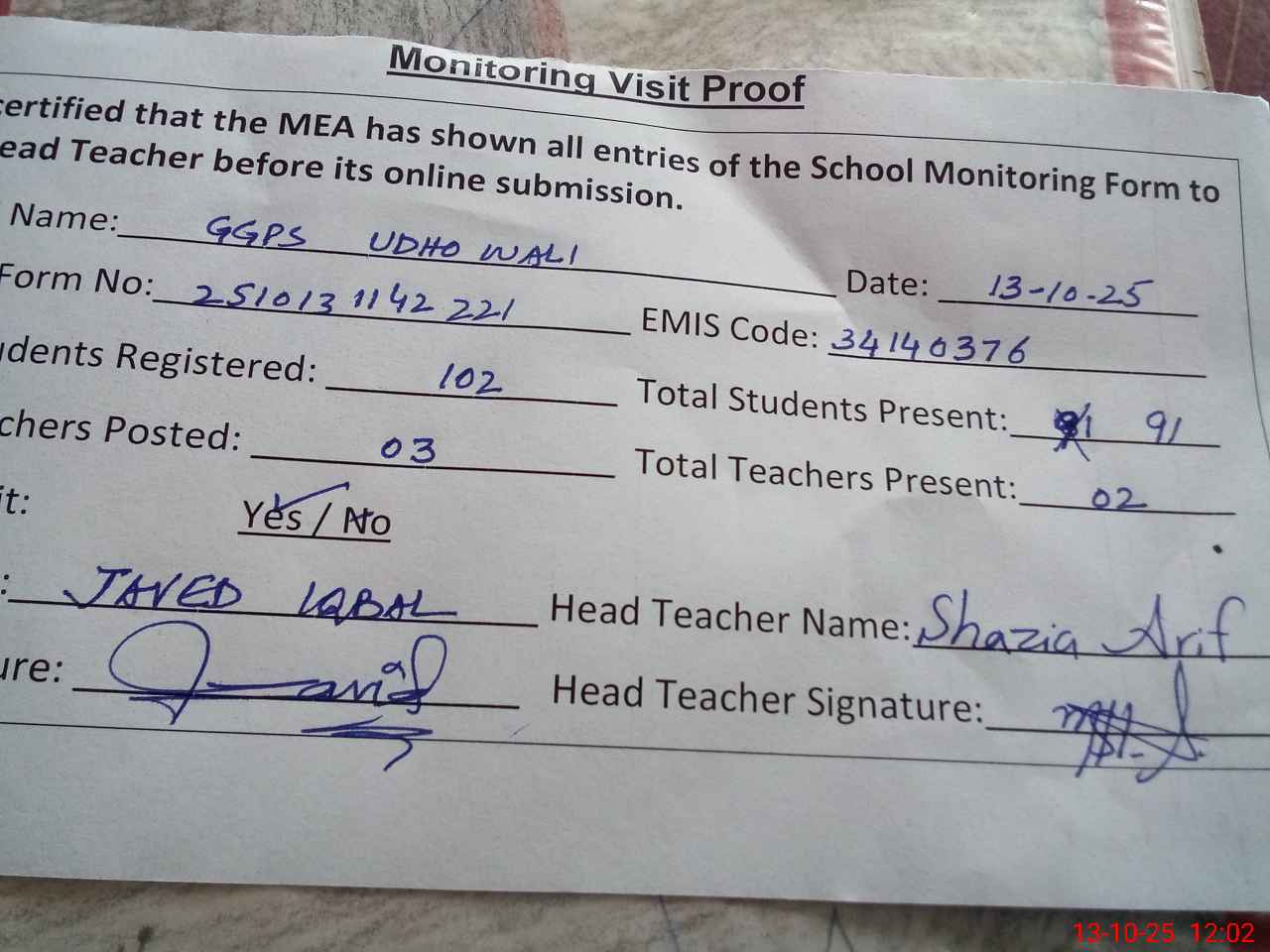 | Attendance Register | Head Teacher | MEA with School | Visit Proof |