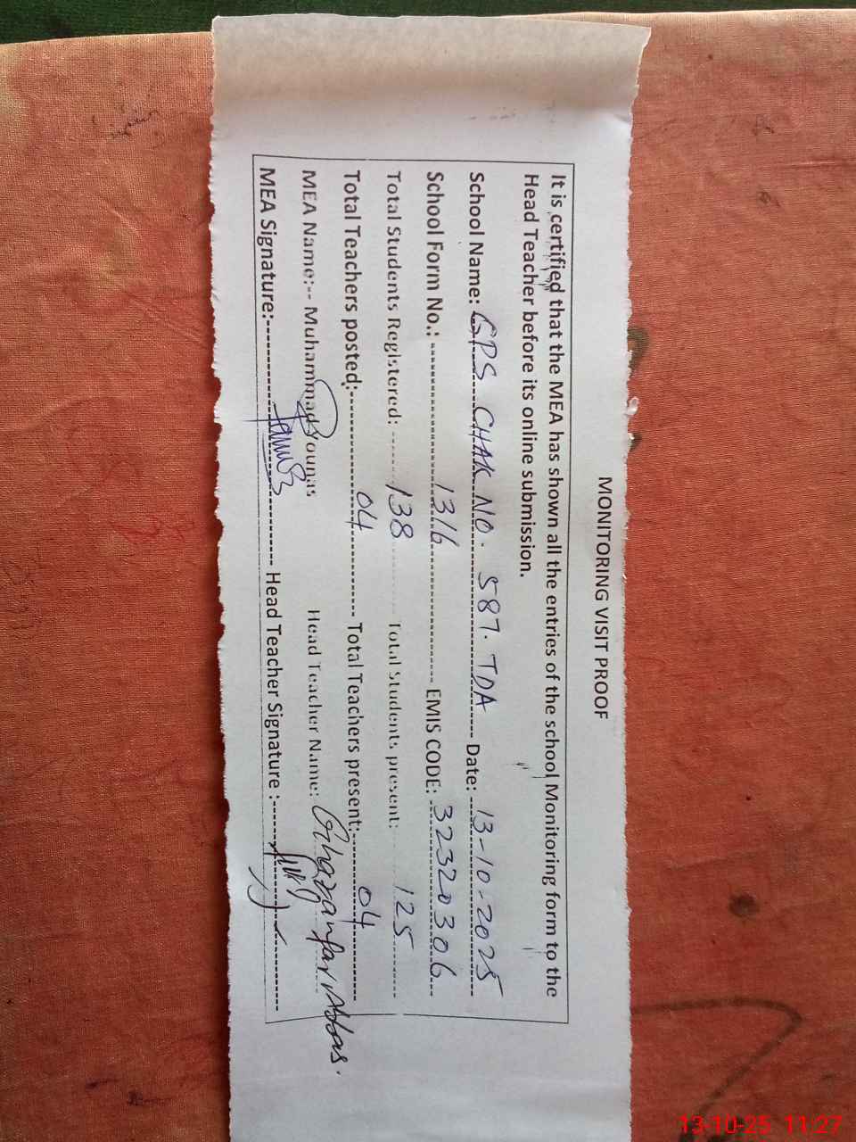| EMIS Code: 32320306 | Name of School: GPS CHAK NO.587 TDA | |||