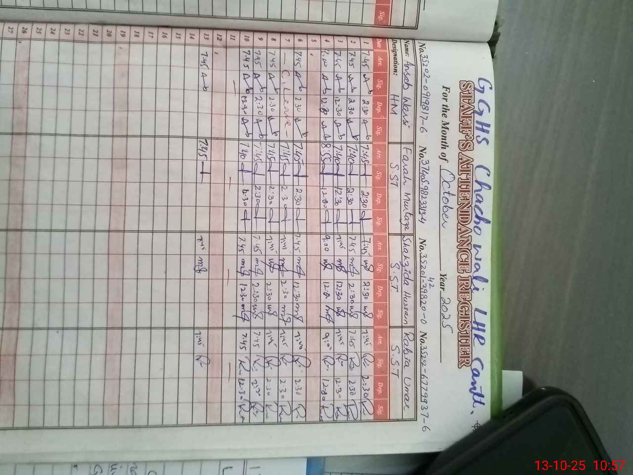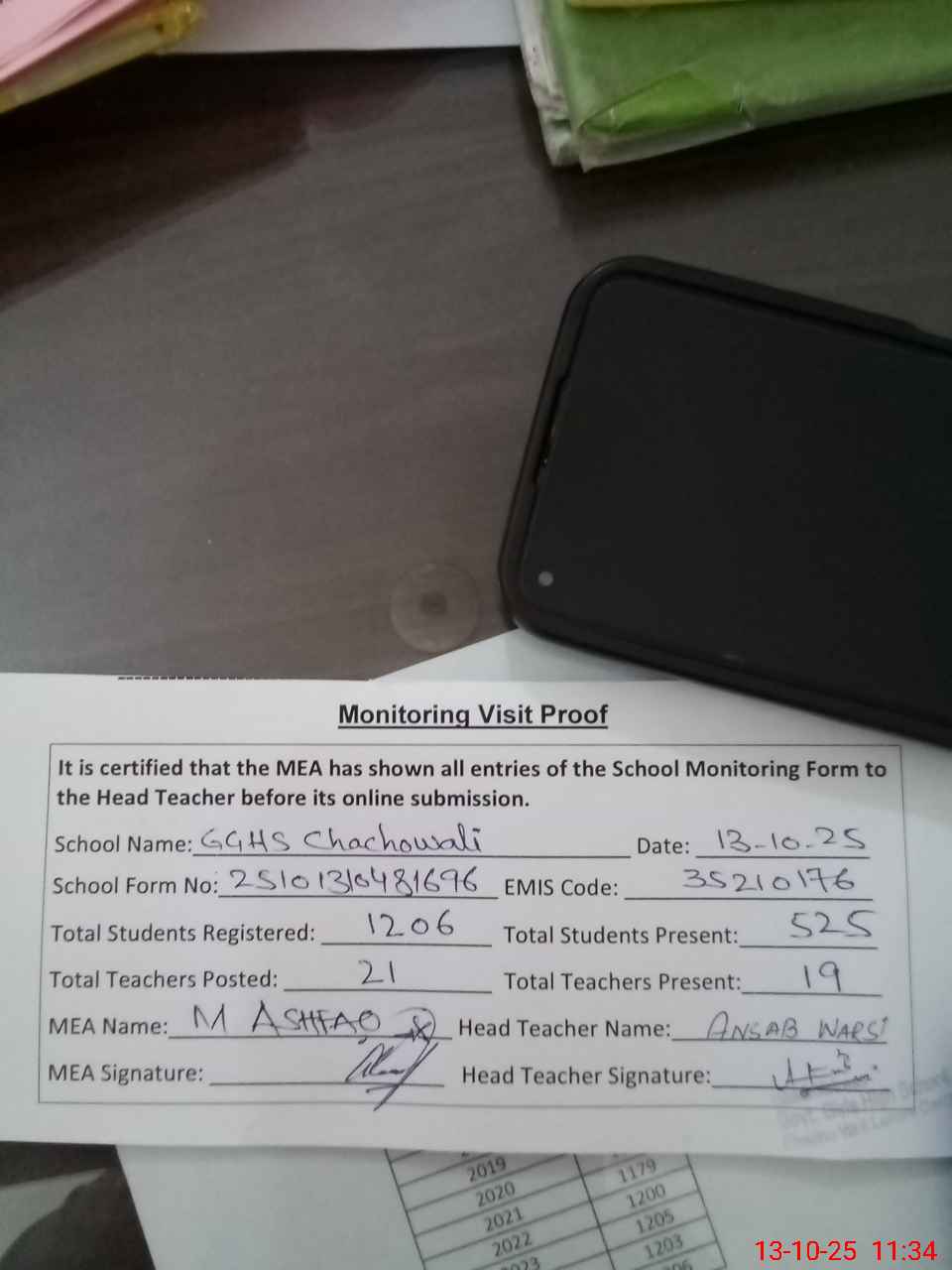 | Remarks (Use Separate Page if Required): PST Hina Rafiq absent since 18 August 25 PST Tahira Shaheen attached with GGHS Green Town exmcl but her written Orders not available so mark him absent Bank statements of both accounts not available for September 25 Council Meeting register not updated for the month of September 25 Over all whole the school building looking poor condition of paint work 35210176 | |||||