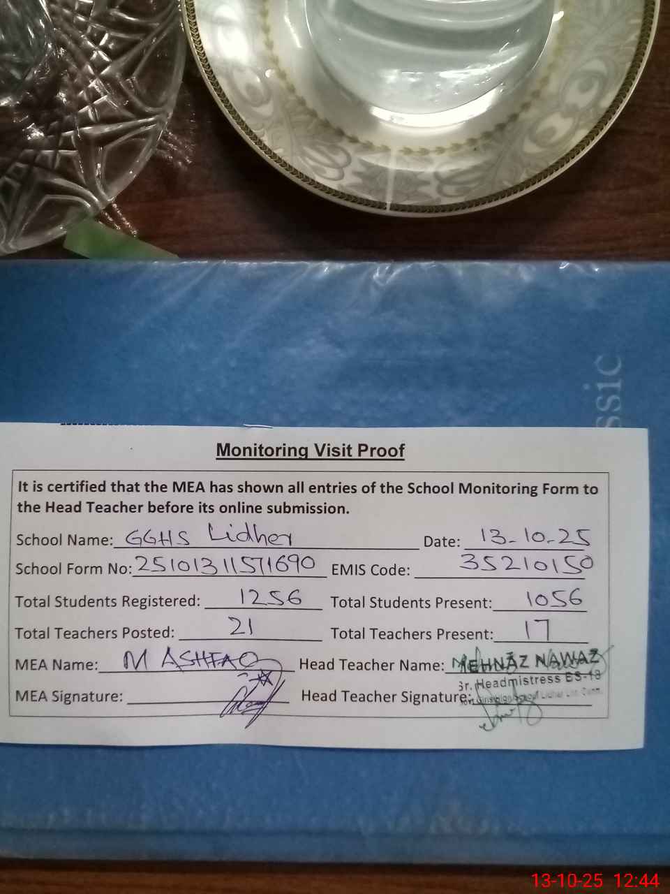 | Attendance Register | Head Teacher | MEA with School | Visit Proof |
