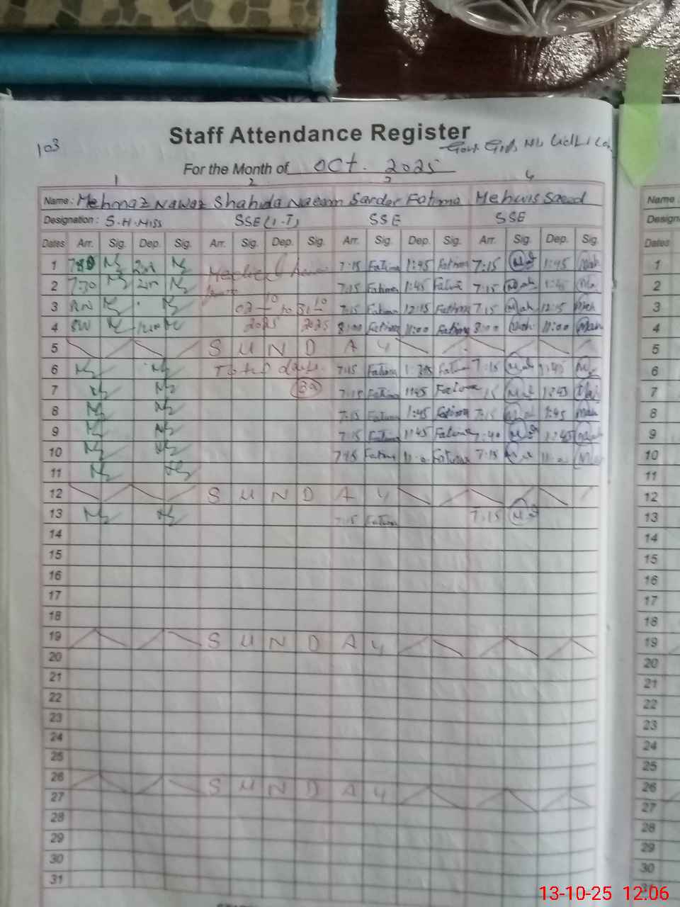 | Remarks (Use Separate Page if Required): SSE Shahida Naeem on Medical but still under process of applying so mark him absent Naib Qasid Soha Shoukat attached here and her latest orders available NSB and FTF registers not updated for the month of September 25 03 classrooms are dangerous and not in use One side of boundary wall is looking damaged urgent maintenance required Cleaning is not up to standard School has large ground but need to plant the grass at here 35210150 | |||||