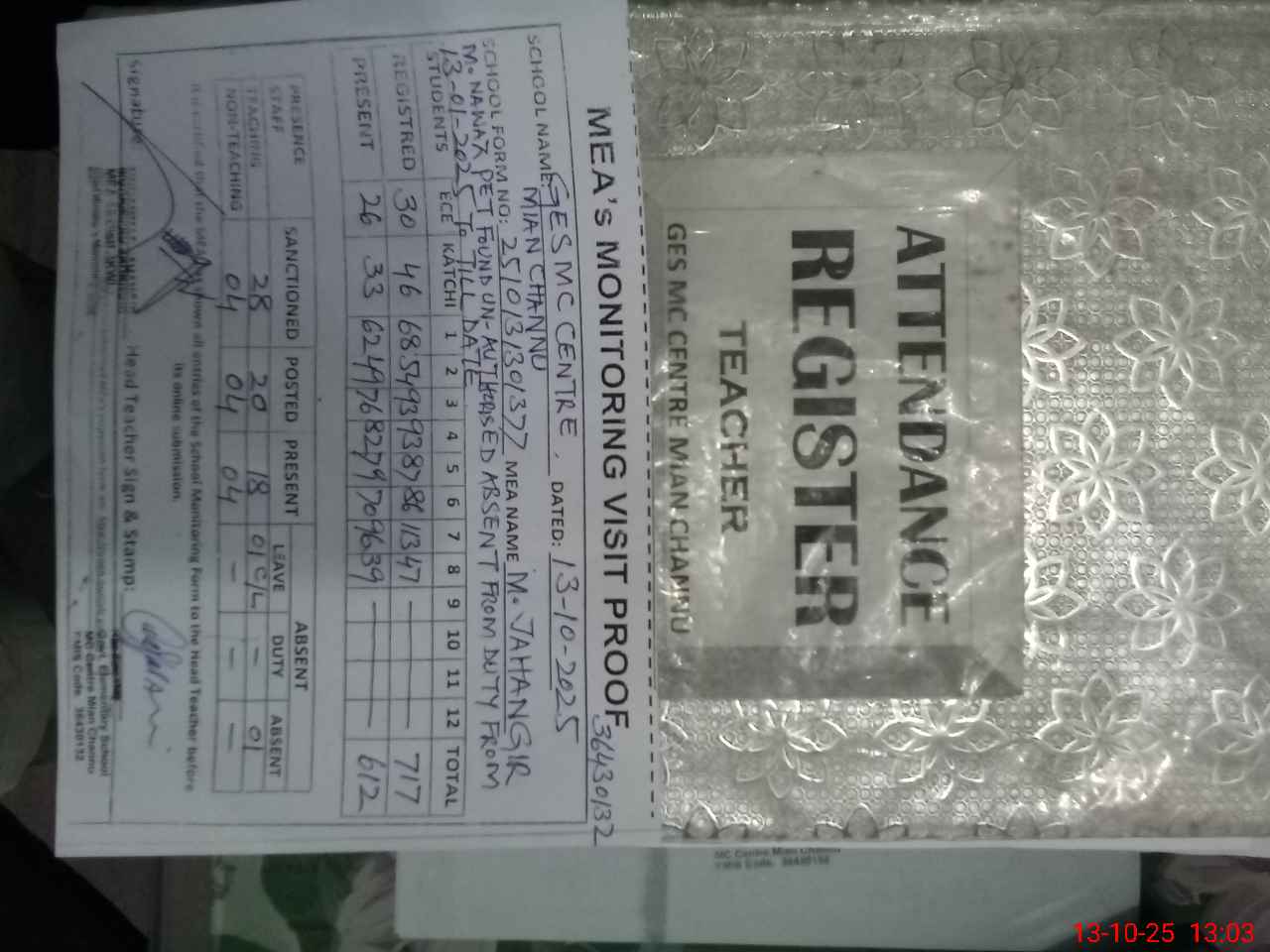 | Attendance Register | Head Teacher | MEA with School | Visit Proof |
