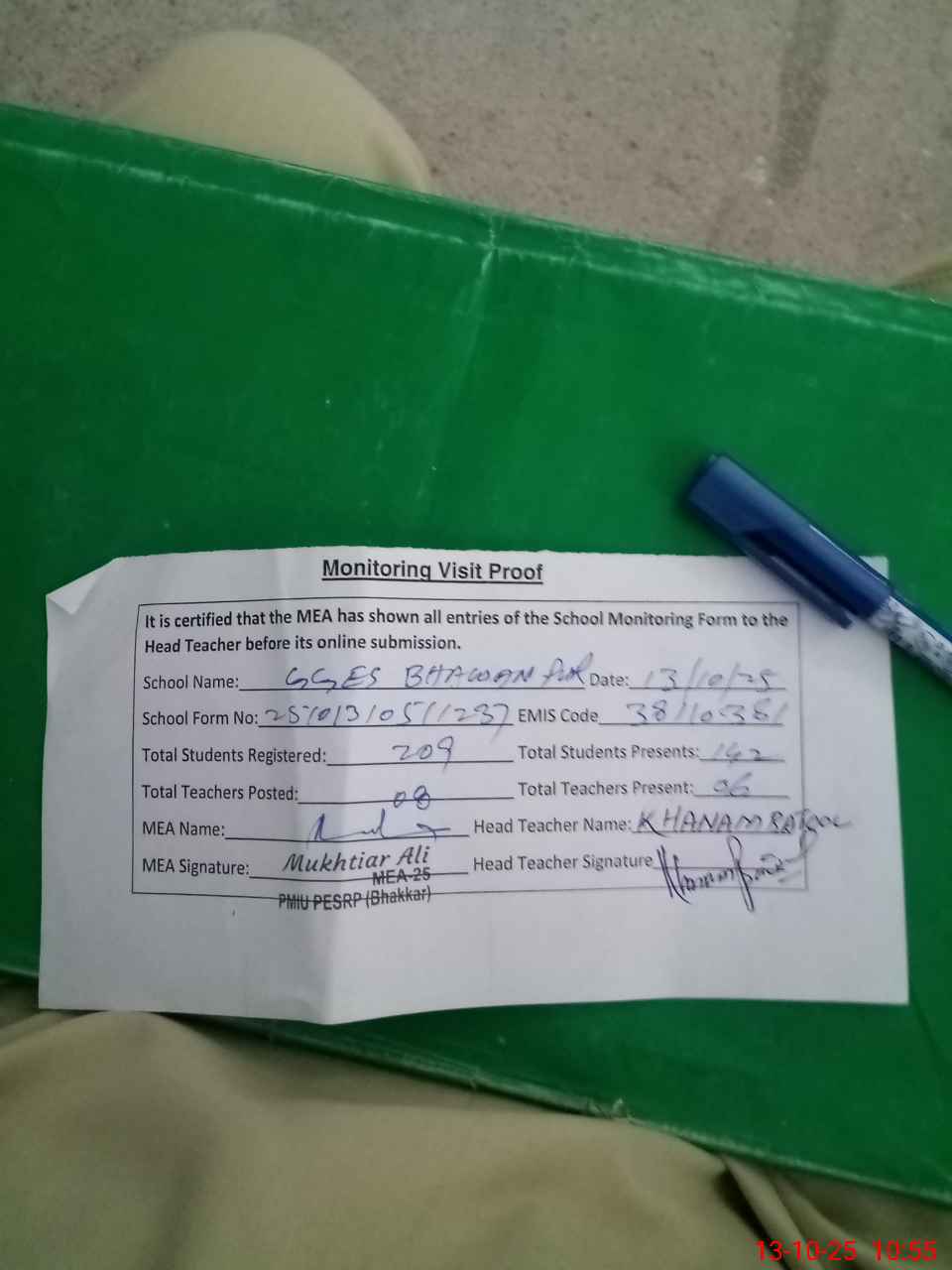 | Attendance Register | Head Teacher | MEA with School | Visit Proof |
