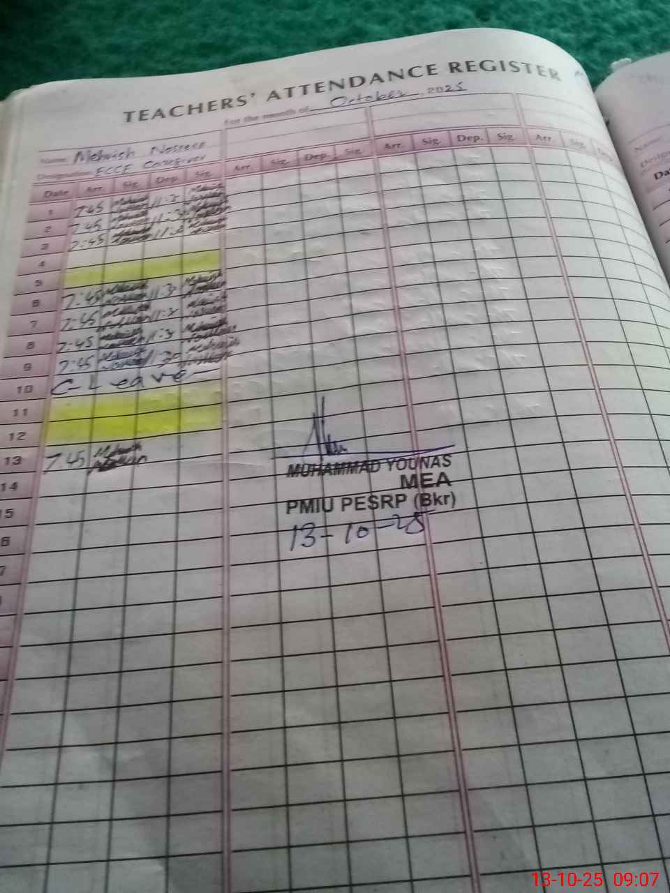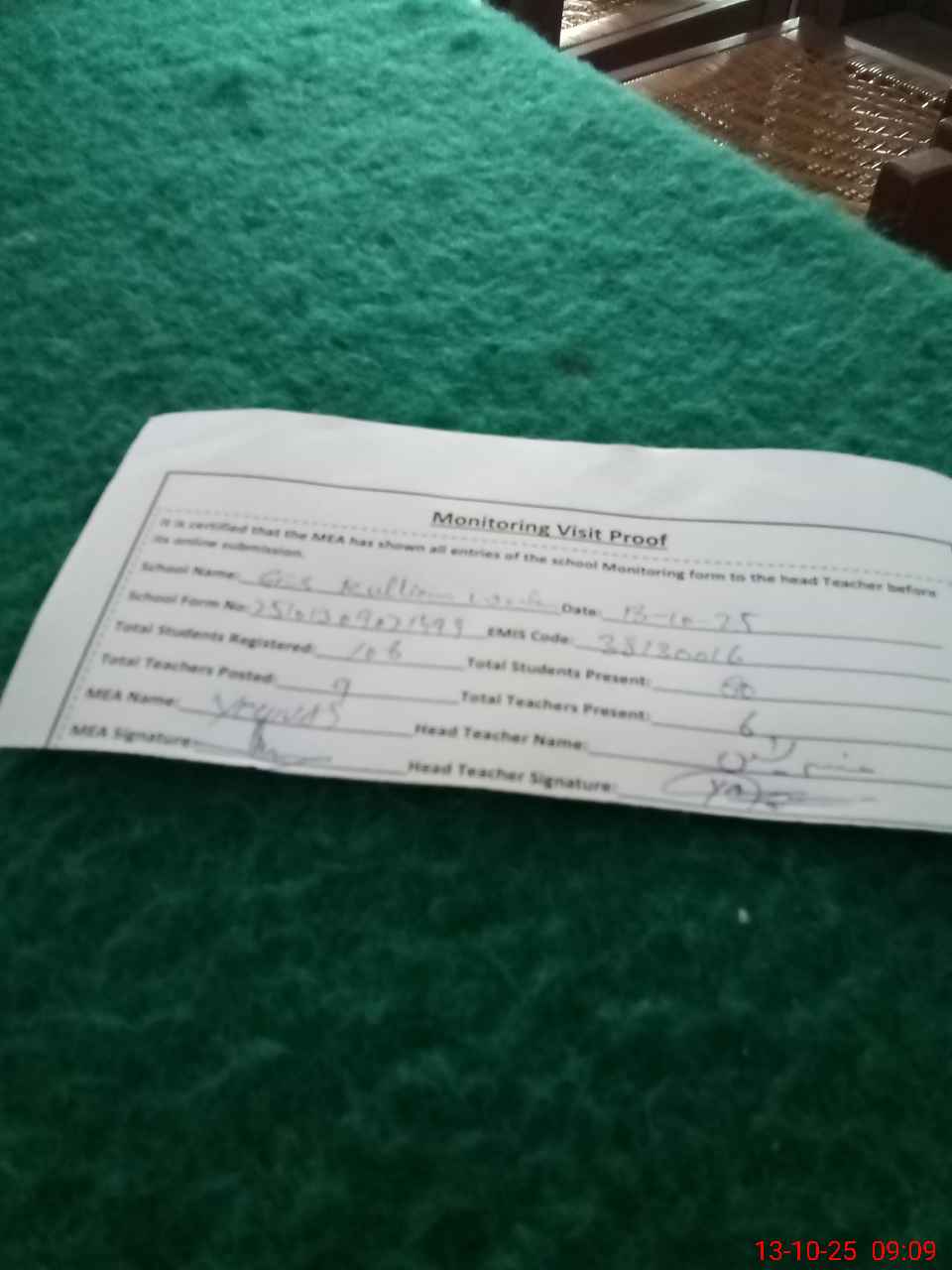 | Attendance Register | Head Teacher | MEA with School | Visit Proof |