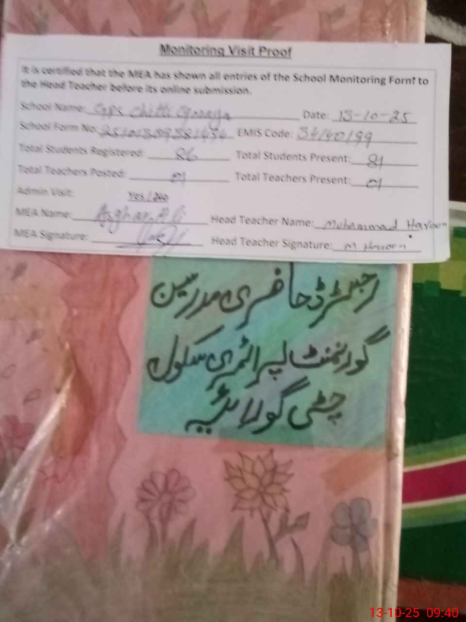 | Attendance Register | Head Teacher | MEA with School | Visit Proof |