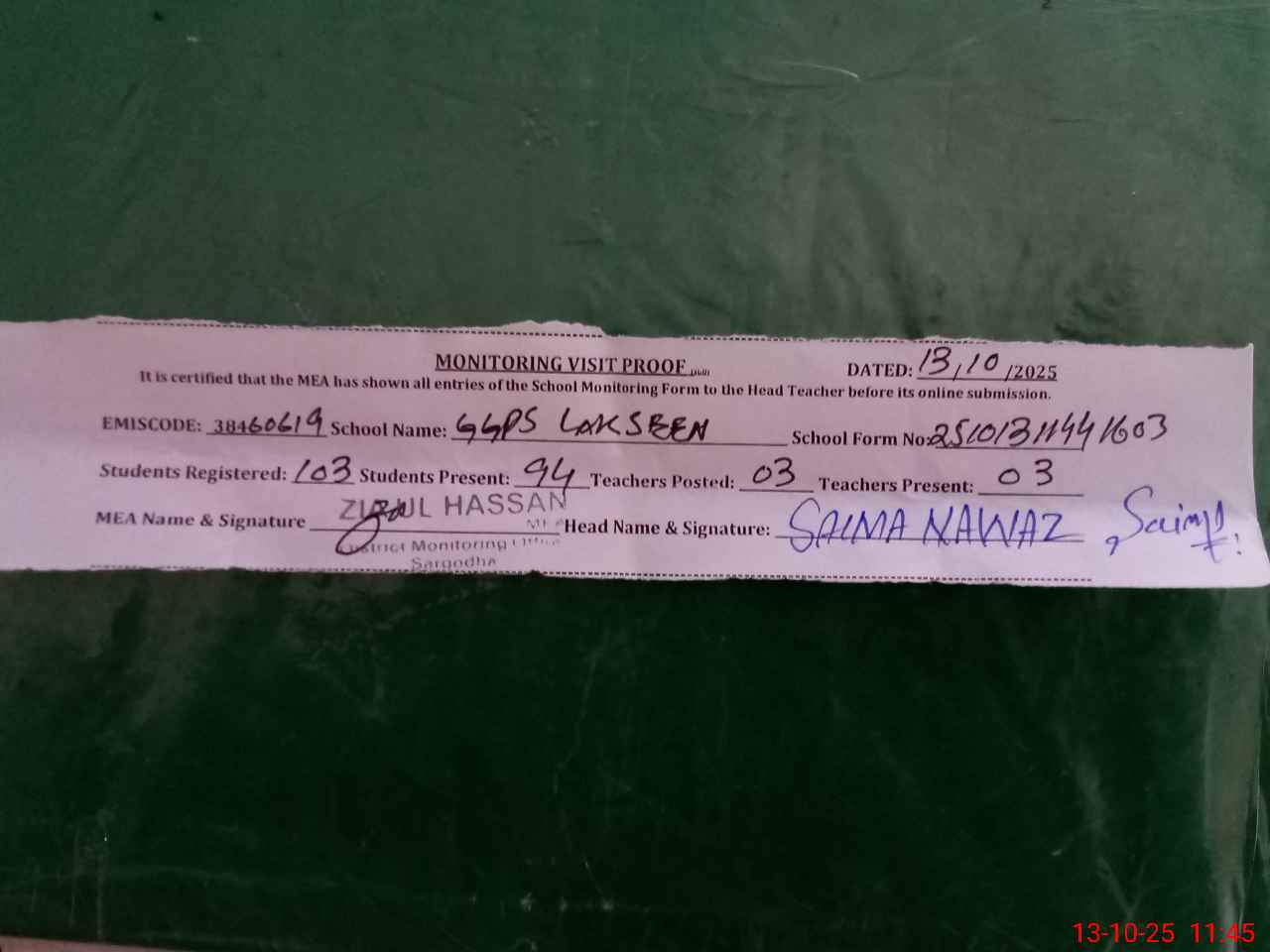 | Certified that this School was Inspected by the Undersigned MEA/DMO Today and the Information Stated Above is as Per Record. | |||||
