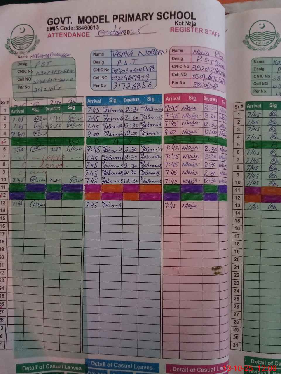 | CNIC | Full Name | Designation | R/C | Absence During Last Calender Month |