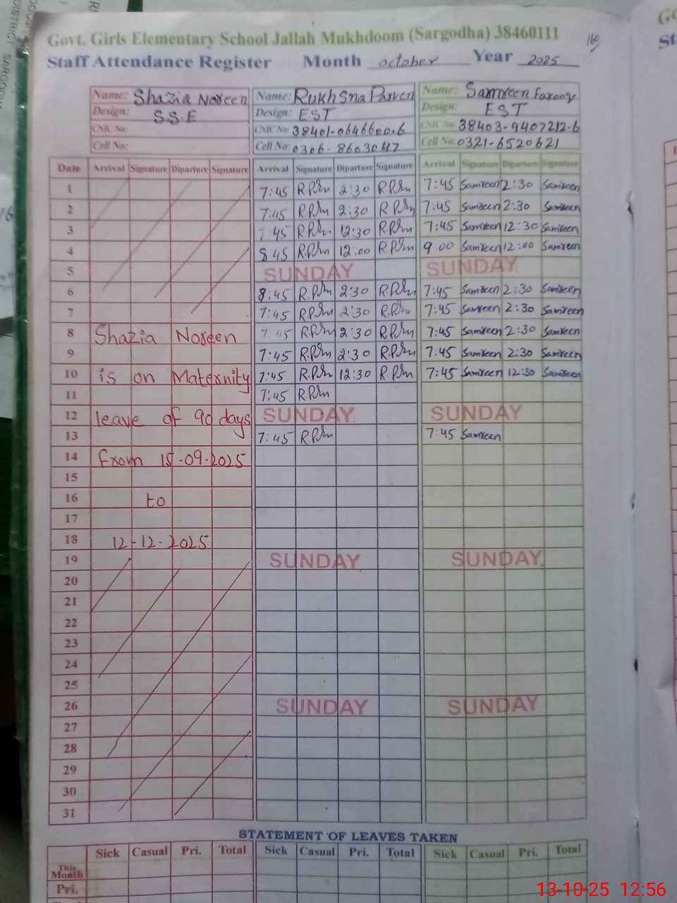 | CNIC | Full Name | Designation | R/C | Absence During Last Calender Month |