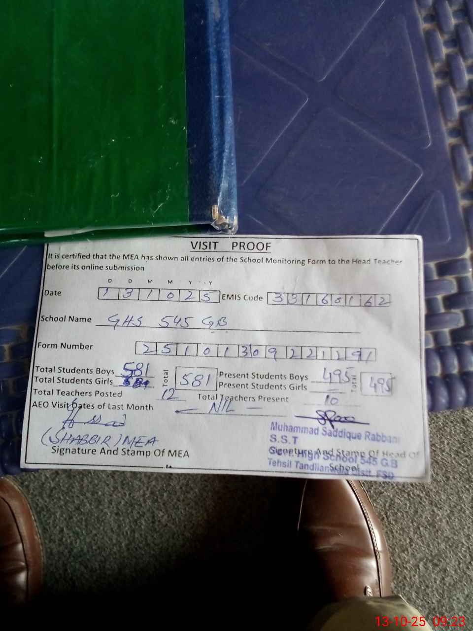 | Attendance Register | Head Teacher | MEA with School | Visit Proof |