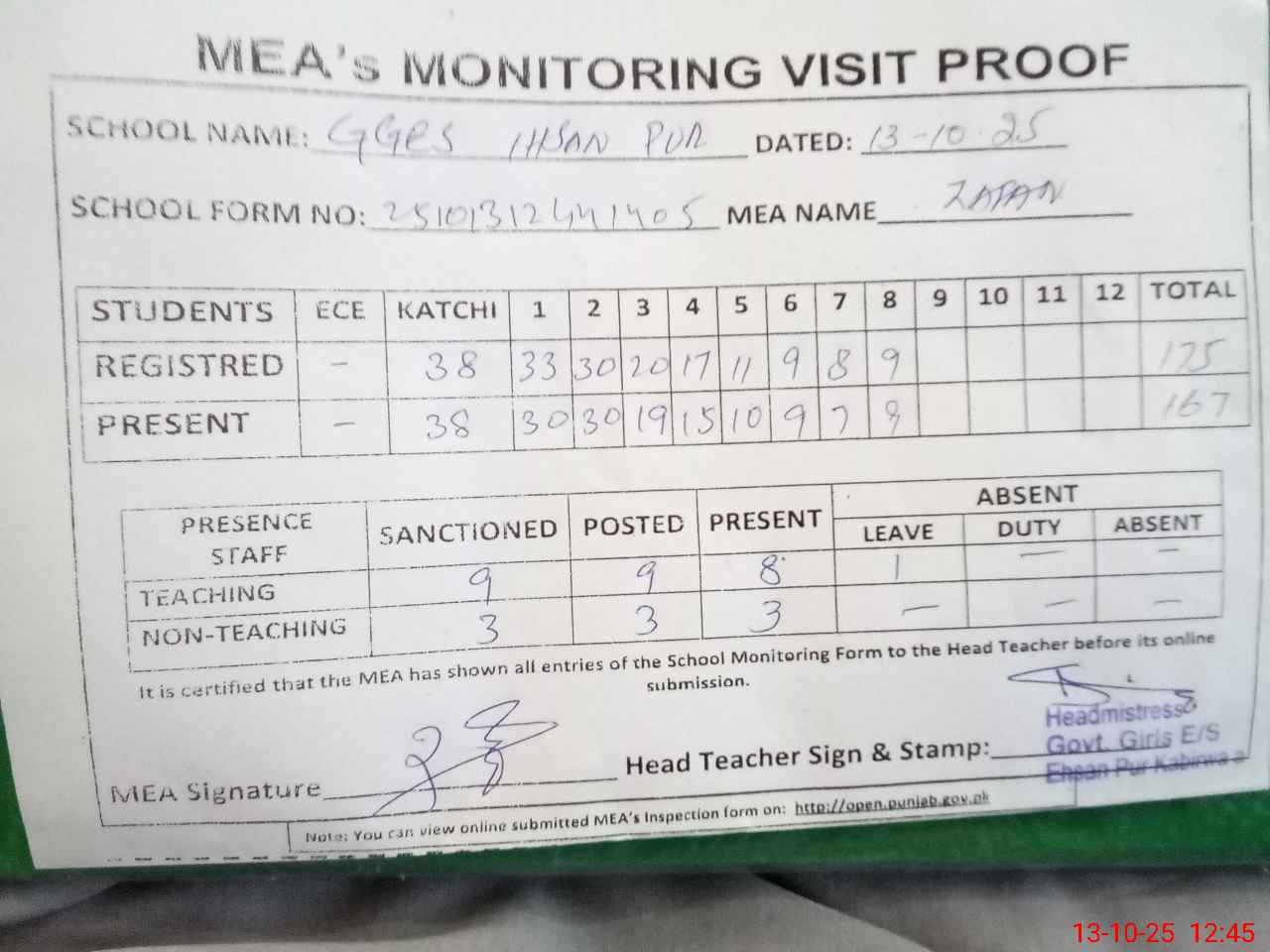 | Attendance Register | Head Teacher | MEA with School | Visit Proof |
