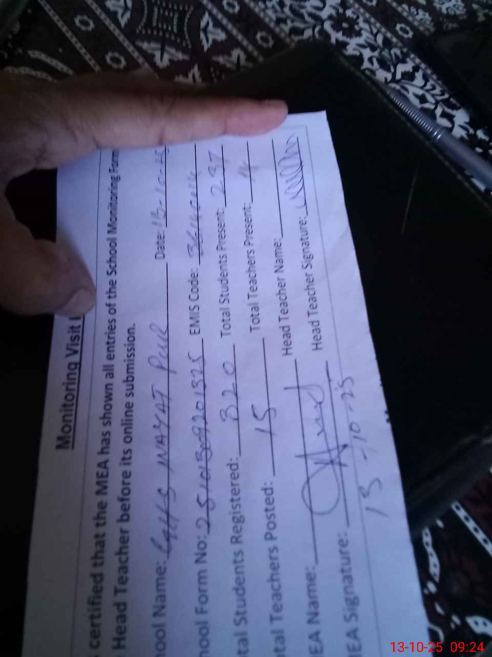 | Attendance Register | Head Teacher | MEA with School | Visit Proof |