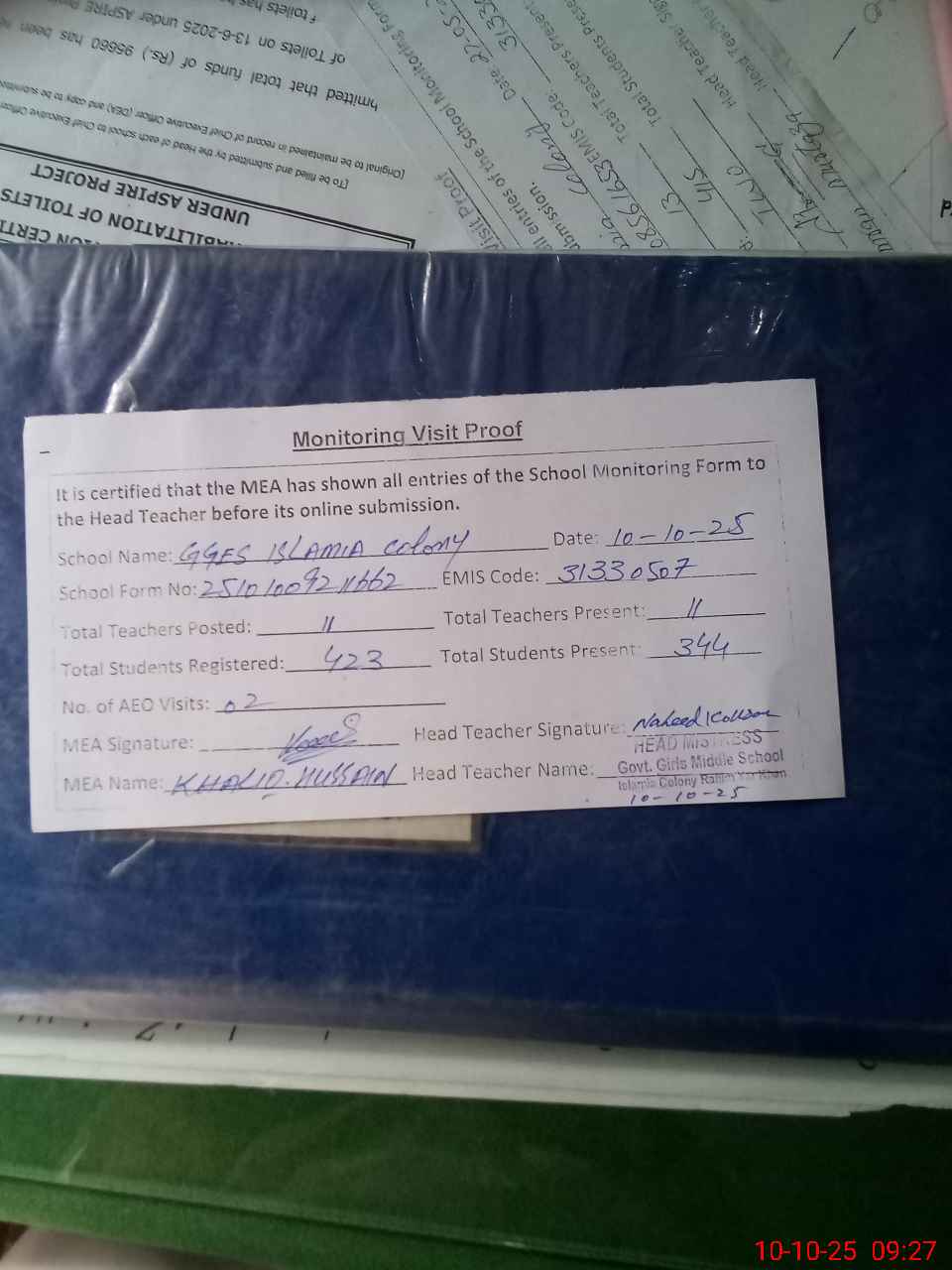 | Attendance Register | Head Teacher | MEA with School | Visit Proof |