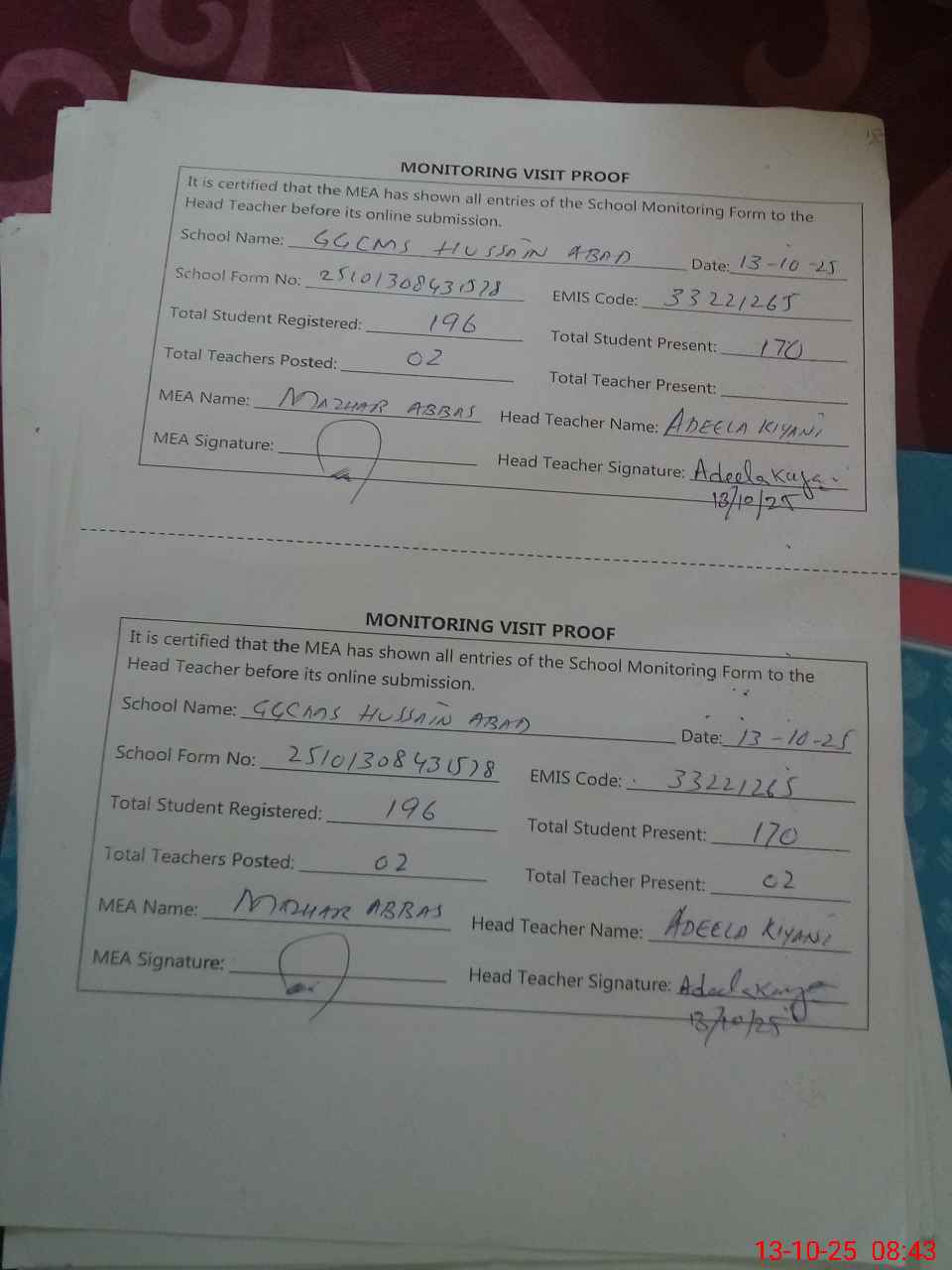 | Attendance Register | Head Teacher | MEA with School | Visit Proof |